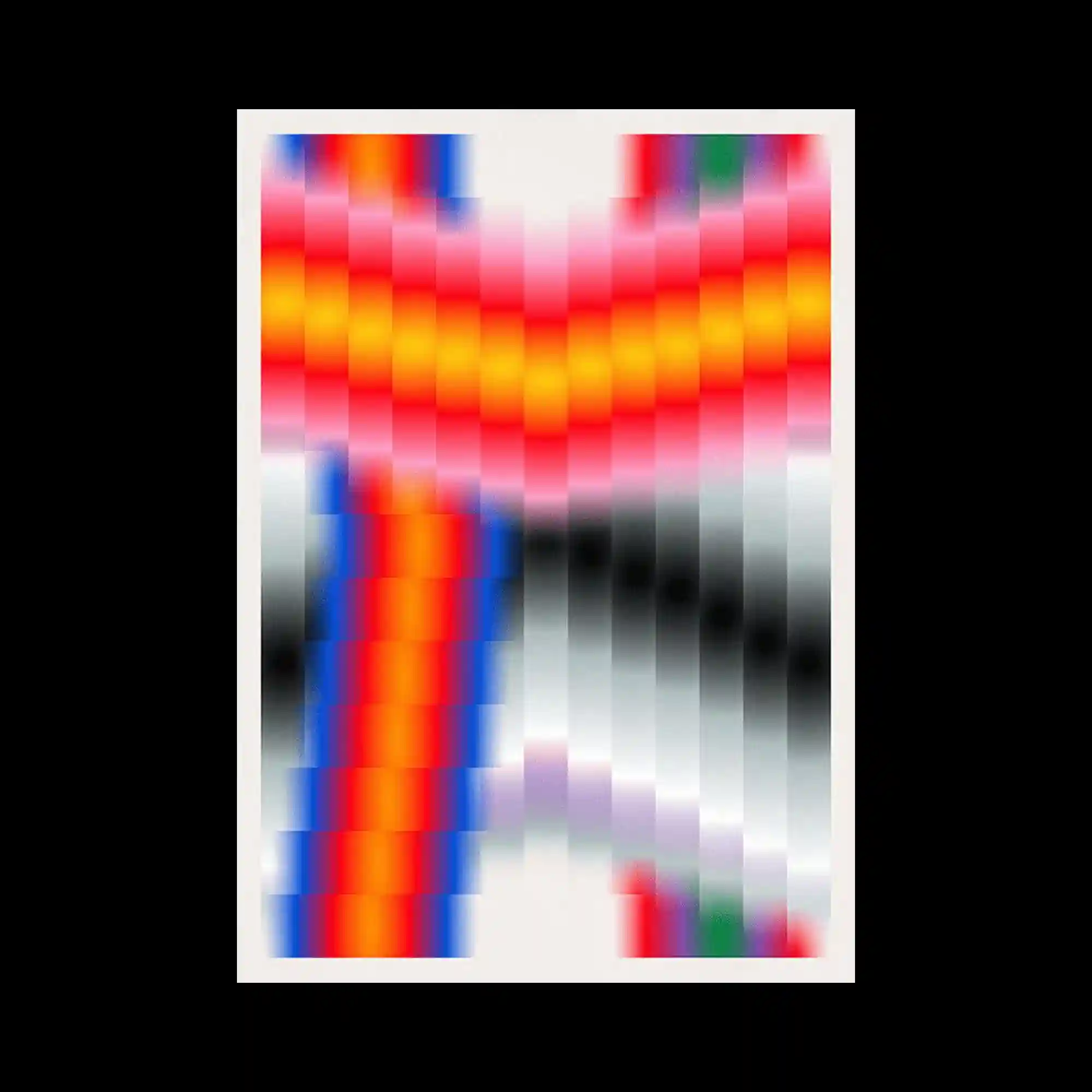@mynameiswendystudio | The design layers striped bars and gradients to simulate stacked objects or pages, giving the illusion of volume within a flat poster. Each horizontal band shifts in hue and lightness, producing a sense of physical layering. The composition balances minimal typographic elements with precise symmetry, creating an orderly yet dynamic visual rhythm. The overall impression recalls modernist precision infused with digital gloss.