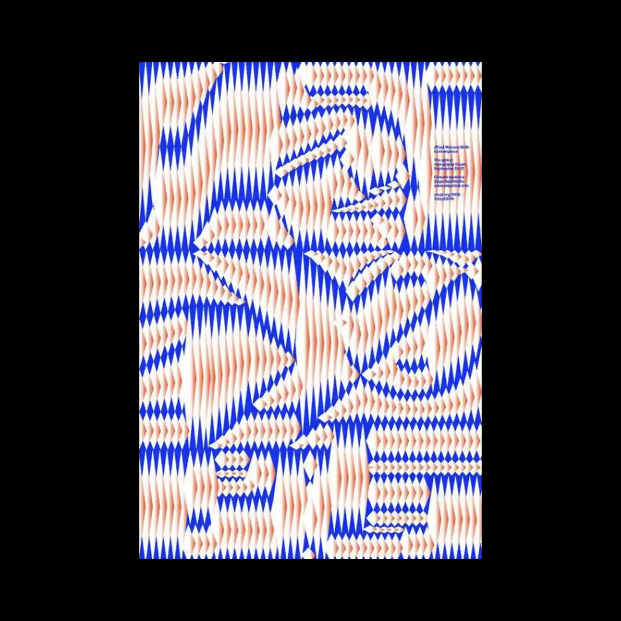 @edgarbakstudio | The surface is filled with dense blue and orange wave-like patterns, producing an optical vibration across the frame. The alternating diagonal shapes generate a moiré effect that creates motion through repetition. Despite the abstract geometry, the overall rhythm feels organic, almost like ripples in fabric or sound waves. The tension between order and distortion gives the composition a hypnotic quality.