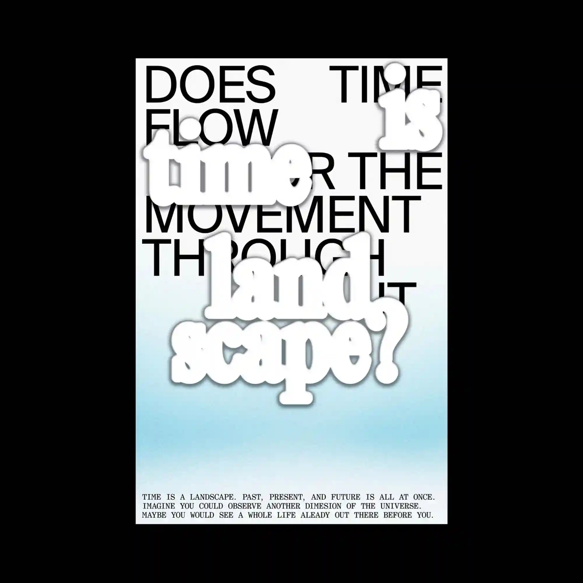 @inyeongcho | Large black sans-serif text is overlaid with soft, cloud-like white words that float in the foreground. The layered typography explores the relationship between conceptual and visual time, blending gradients from white to cyan that suggest depth and atmosphere. The composition’s hierarchy shifts depending on focus—foreground words appear tactile while background text provides structural rhythm. The overall effect is contemplative, balancing spatial and temporal perception.