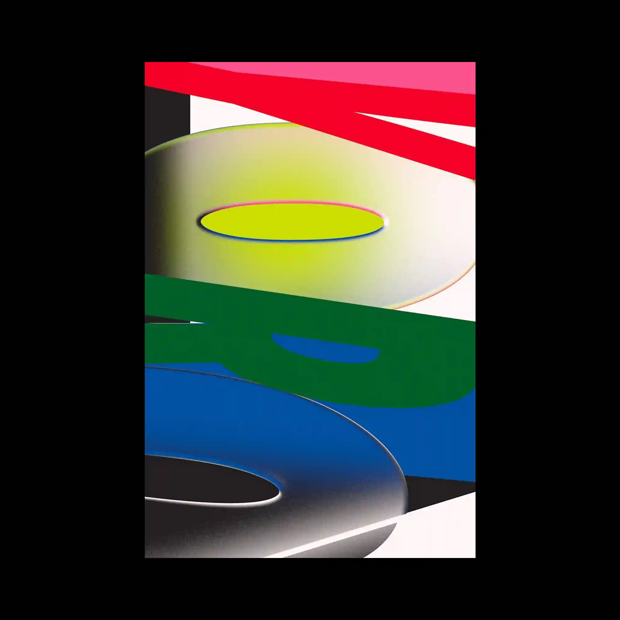 The composition features overlapping geometric bands in vivid red, green, blue, and yellow tones, each with soft airbrushed gradients that create depth and movement. The shapes are arranged diagonally across the canvas, producing a dynamic rhythm that feels both typographic and abstract. The use of shadow and highlight emphasizes the curvature of each form, suggesting dimensionality within a flat layout. The overall balance between saturated color and negative space results in a bold yet controlled visual tension.