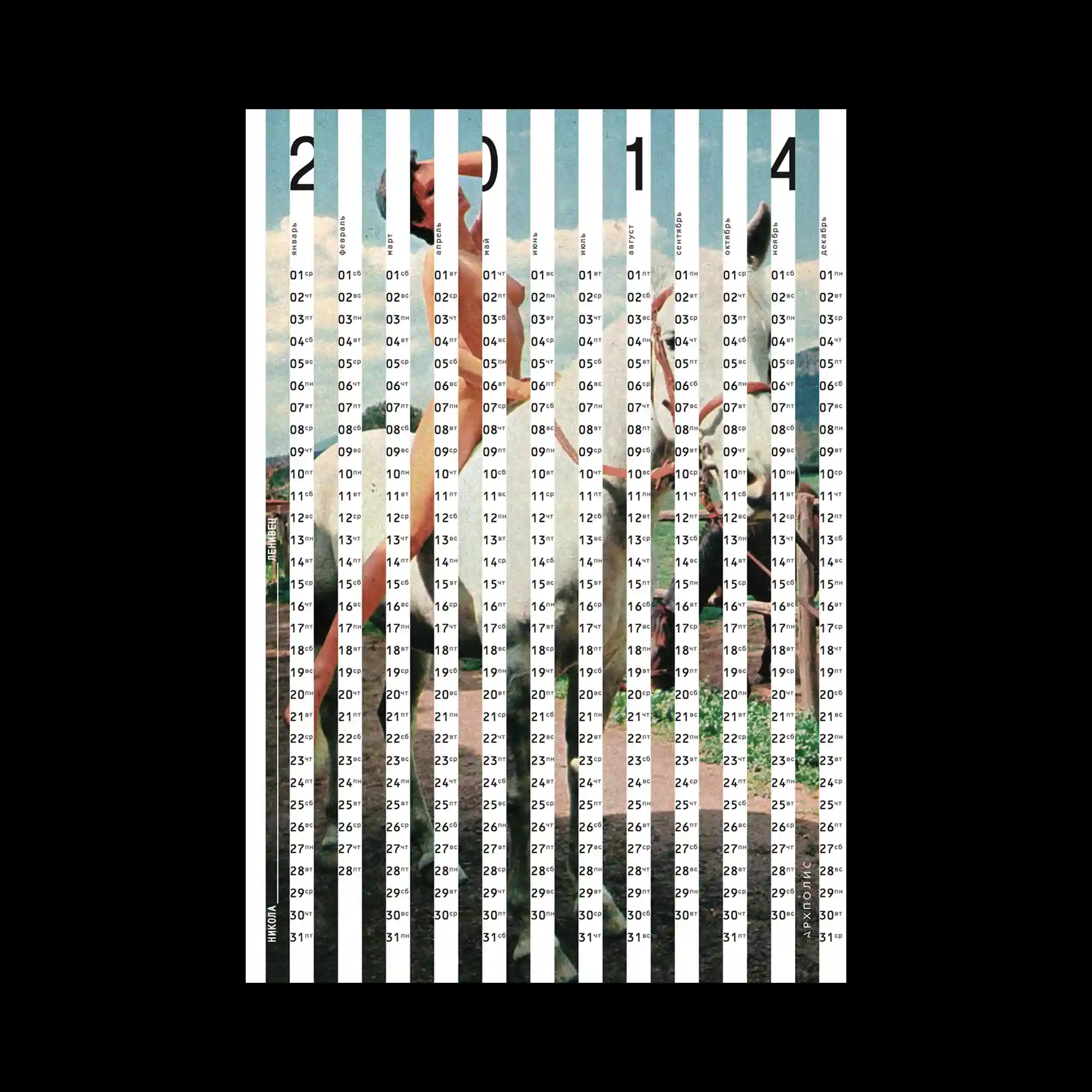 Vertical white bars divide an image of figures in motion, creating a striped rhythm that doubles as a calendar layout. Each strip contains dates and temperature markings, fusing graphic structure with documentary content. The underlying image of summer activity appears fragmented, as if seen through blinds. The design balances data and nostalgia through its precise grid and faded photo texture.