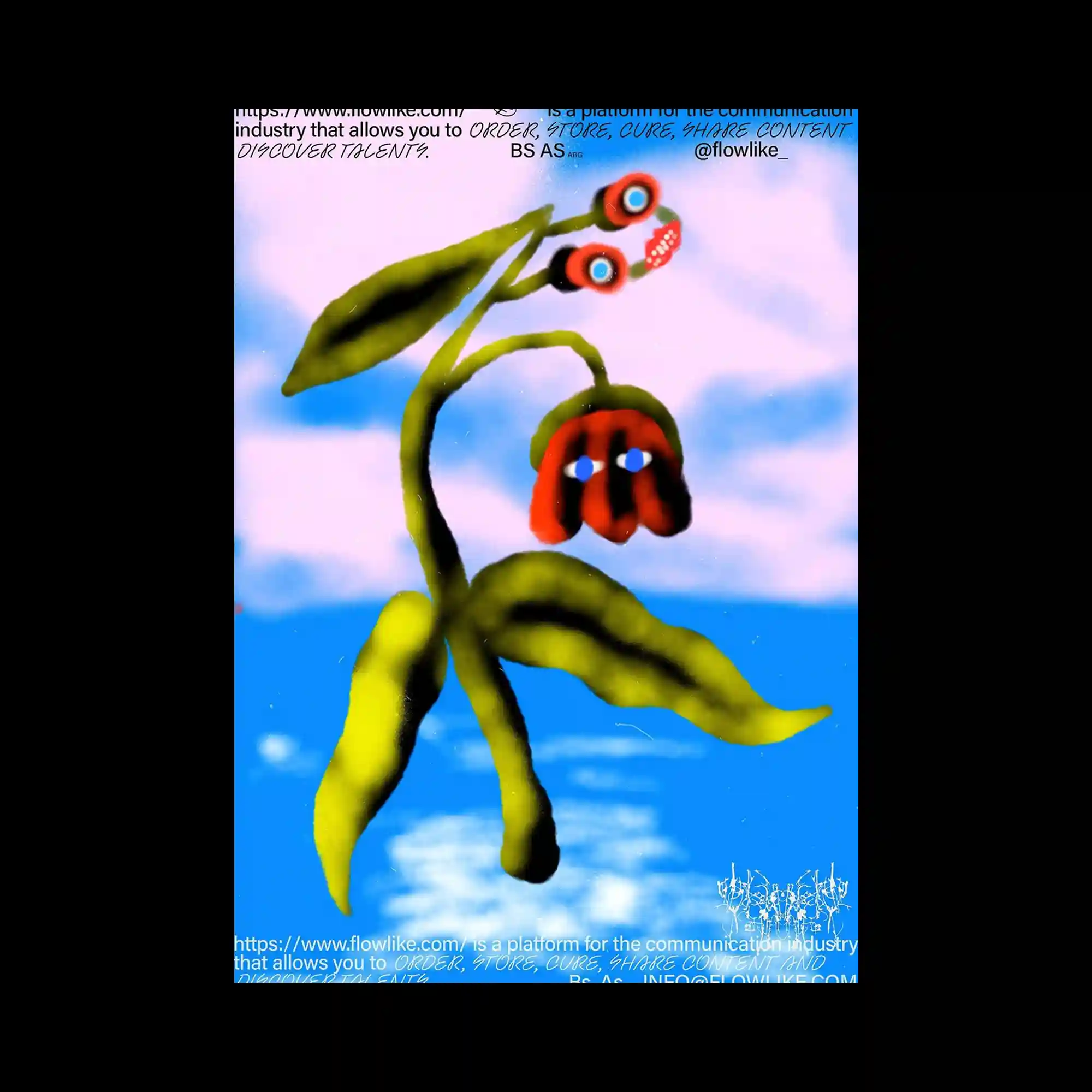 @_los_caballos | A surreal plant-like figure rises against a gradient sky, its leaves rendered in soft airbrush strokes of green and yellow. The stem bends fluidly, supporting two red flower forms that resemble expressive faces, blending organic and anthropomorphic qualities. The dreamy blue and pink background gives a floating, otherworldly atmosphere. The image merges nature and imagination, evoking digital surrealism through painterly softness.