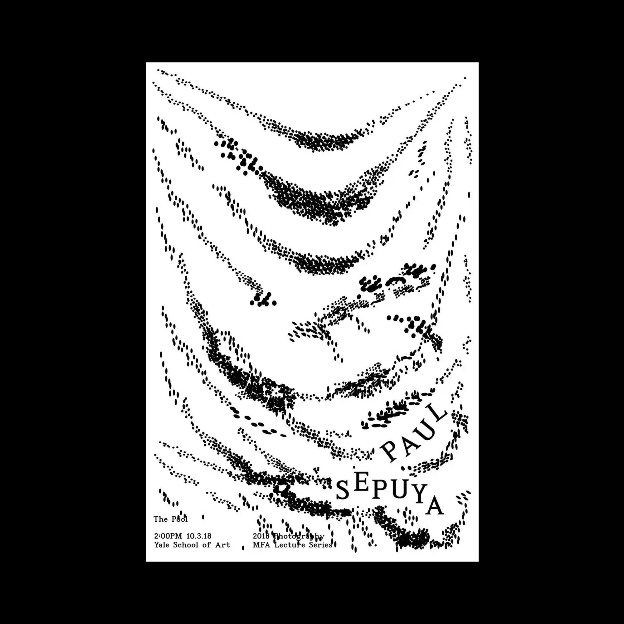 Sparse black dots form sweeping, wave-like trails on a white background, suggesting fabric folds or motion traces. The typographic elements are delicately positioned to follow the curved flow, integrating seamlessly into the composition. The simplicity highlights rhythm through repetition and spacing. The poster embodies quiet motion within a minimal monochrome field.