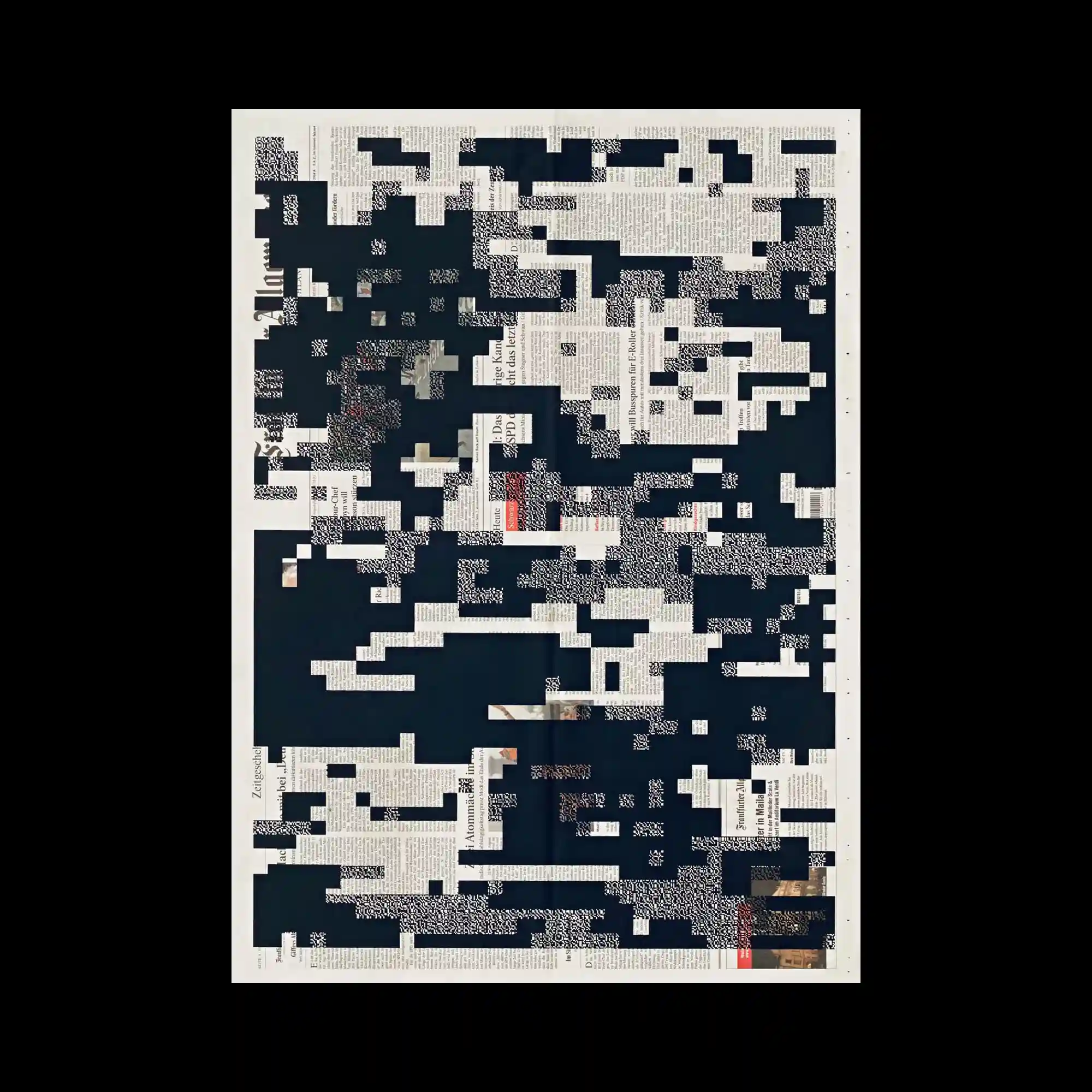 A newspaper-like texture is overlaid with fragmented black rectangles, creating a sense of digital interference or redaction. The scattered gaps reveal bits of printed text and images beneath, forming a layered visual narrative. The grid-like disruption mimics data corruption or censorship. The contrast of analog material and digital abstraction evokes a dialogue between memory and loss.