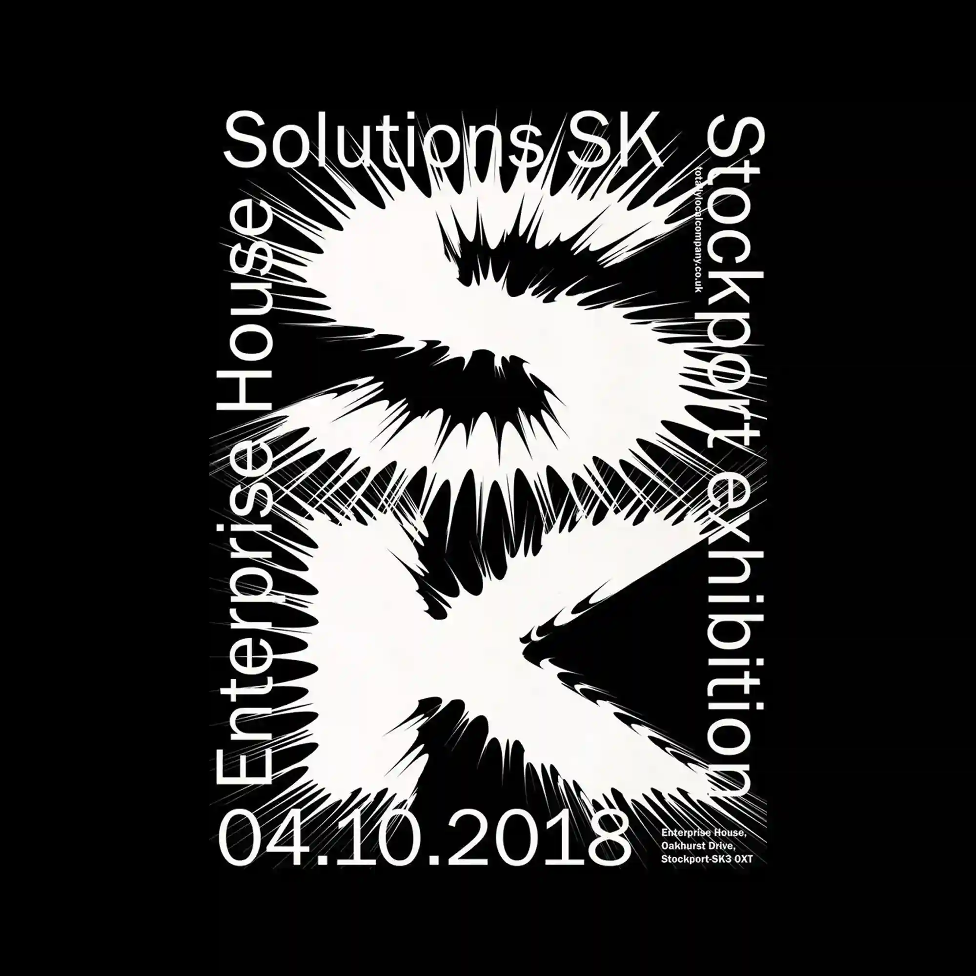 The composition features a bold white form at the center that appears to burst outward, creating sharp radial spikes with high-contrast black edges. Surrounding typography aligns vertically and horizontally along the border, forming a rigid frame against the organic explosion shape. The central figure’s dynamic, almost liquid distortion introduces a strong sense of motion and tension. Negative and positive space interact tightly, giving the entire poster an energetic, vibrating visual structure.