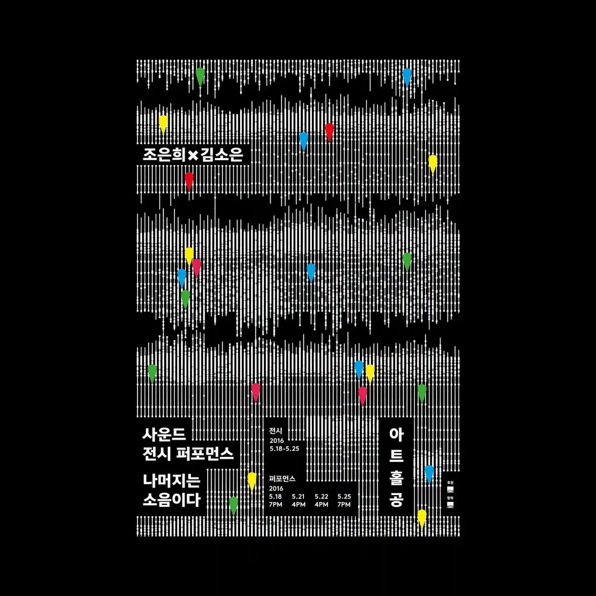 @bohuy_kim | A dense field of vertical white lines forms layered wave-like bands across a black background, creating a pulsating rhythm. Small colored markers punctuate the pattern, adding points of emphasis within the repetitive structure. The lines vary in height, mimicking sound-wave modulation and generating a sense of movement. Overall, the poster builds a dynamic visual rhythm through strict repetition and subtle interruptions.