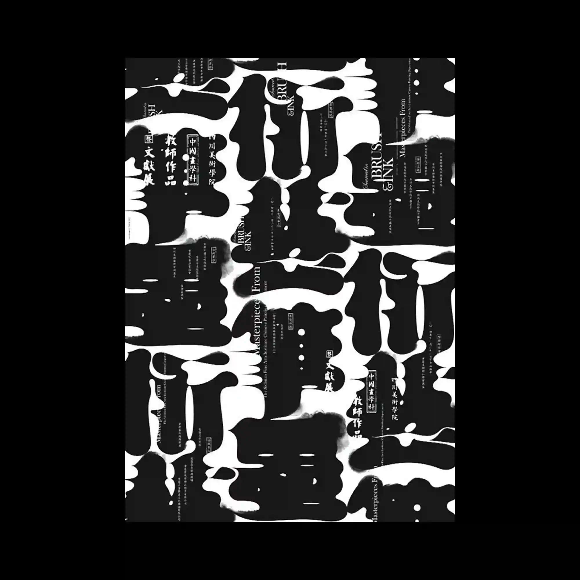 Organic black shapes spread across a white background like ink bleeding on paper, forming irregular columns. Between these shapes, thin lines of typography weave vertically and horizontally, almost submerged within the fluid forms. The soft fade at the edges of the black shapes gives a watercolor effect, contrasting with the precise text. The tension between liquid abstraction and refined typography creates a visually immersive texture.