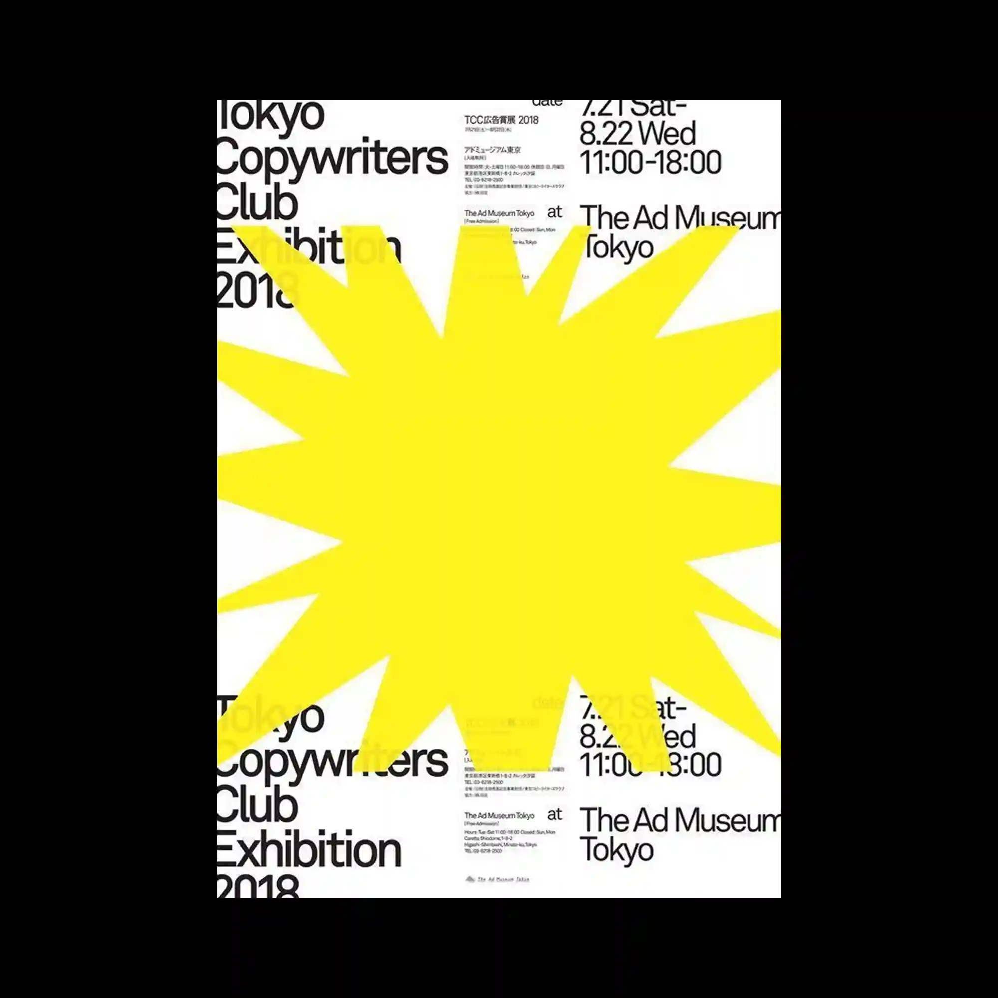 @kubotaarata | A large, irregular yellow burst shape dominates the center, covering much of the underlying black typography. The star-like form radiates outward with uneven spikes, creating a sense of sudden interruption. Beneath it, the clean sans-serif text is arranged in a structured grid, partially revealed at the edges. The tension between the controlled typographic layout and the oversized graphic explosion generates a bold visual contrast.