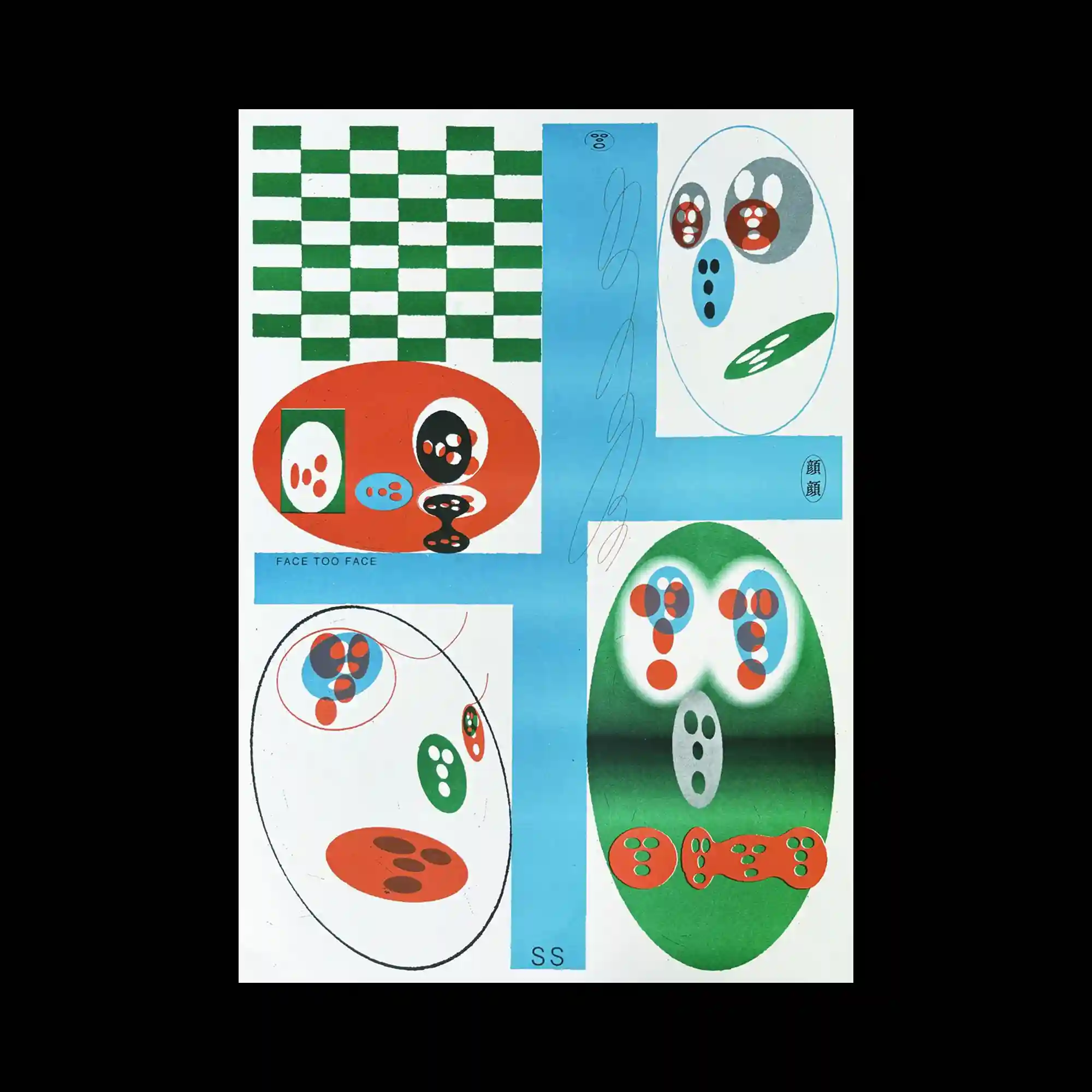 @nuhsikasas | The poster is divided into panels featuring checker patterns, oval compositions, and color gradients. Inside the ovals, small abstract face-like shapes are arranged in various groupings. A vertical blue strip intersects the layout, adding balance to the scattered forms. The arrangement feels playful and experimental, focusing on simple geometric shapes transformed into expressive symbols.