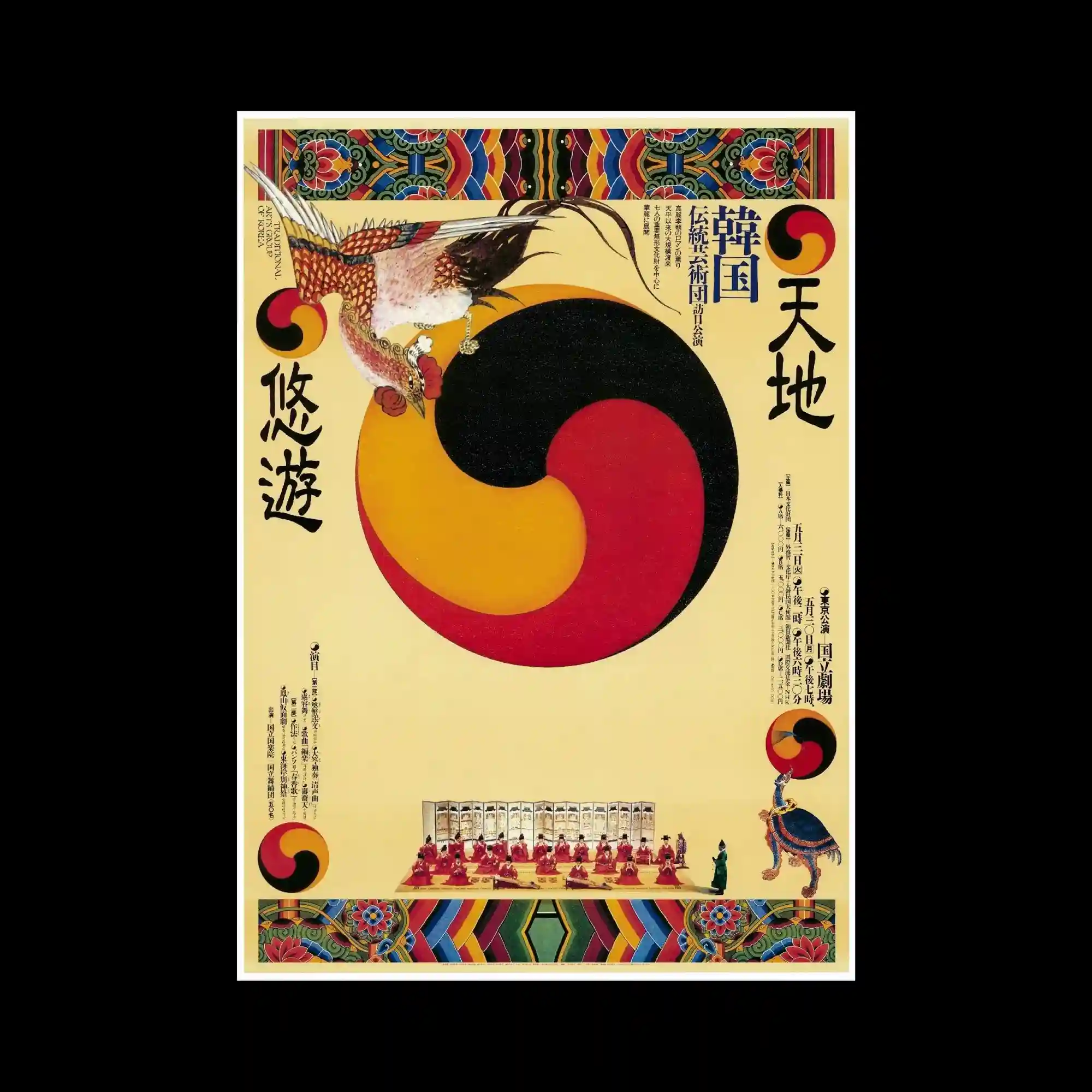 A traditional Korean-inspired composition features a large tri-color taegeuk-like swirl occupying the center. Symmetrical decorative borders frame the top and bottom, using vivid geometric folk patterns. A detailed bird illustration perches on the main circular form, adding narrative character. The arrangement blends flat illustration with symmetrical framing to create a ceremonial, classical tone.