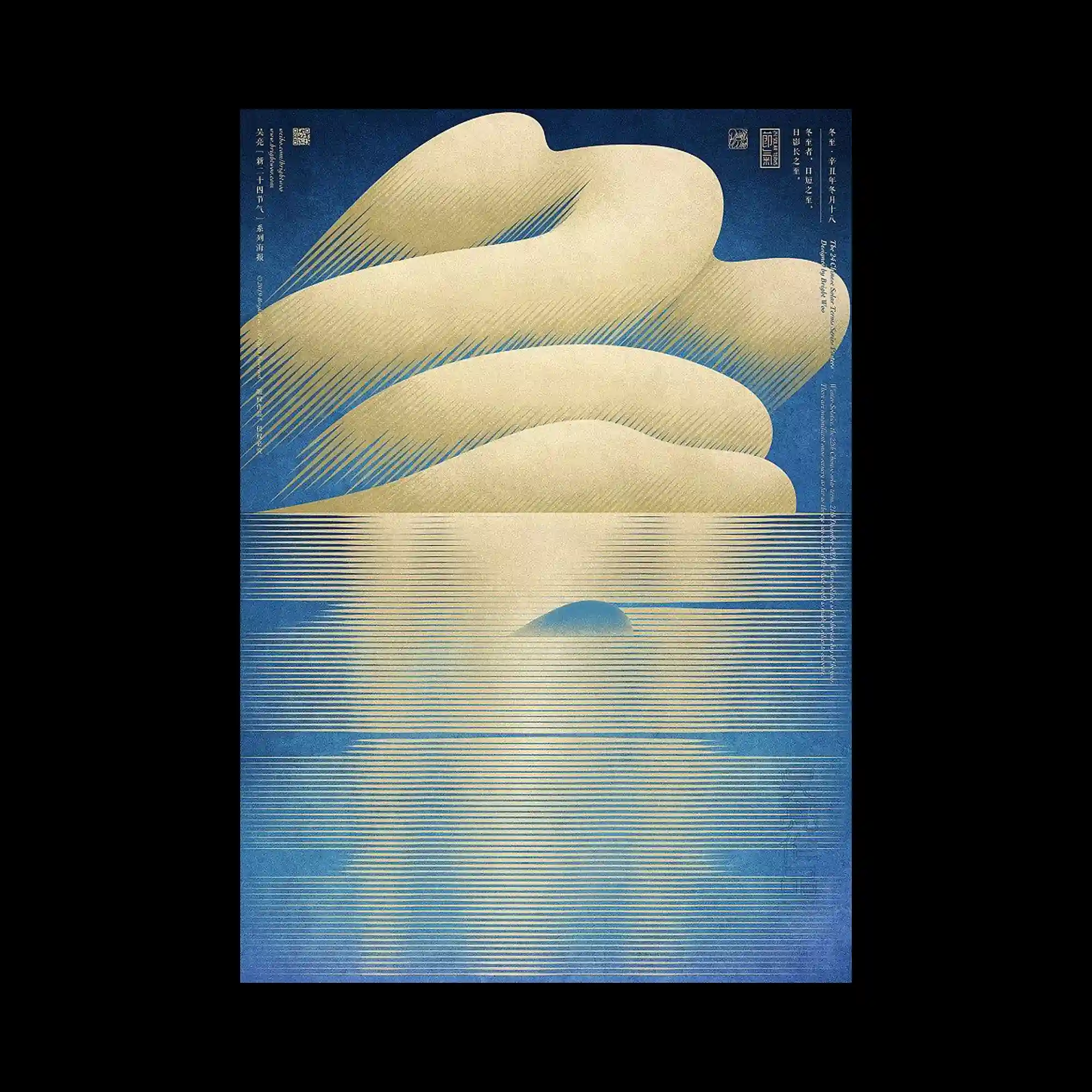 Wu_Liang | Soft beige cloud-like forms sit above a horizontal field of fine golden lines that extend downward like reflections on water. The lines vary subtly in thickness and spacing, producing a shimmering gradient. Deep blue surrounds the scene to evoke sky and depth. The poster uses minimal shapes and refined line repetition to create a serene, atmospheric landscape.