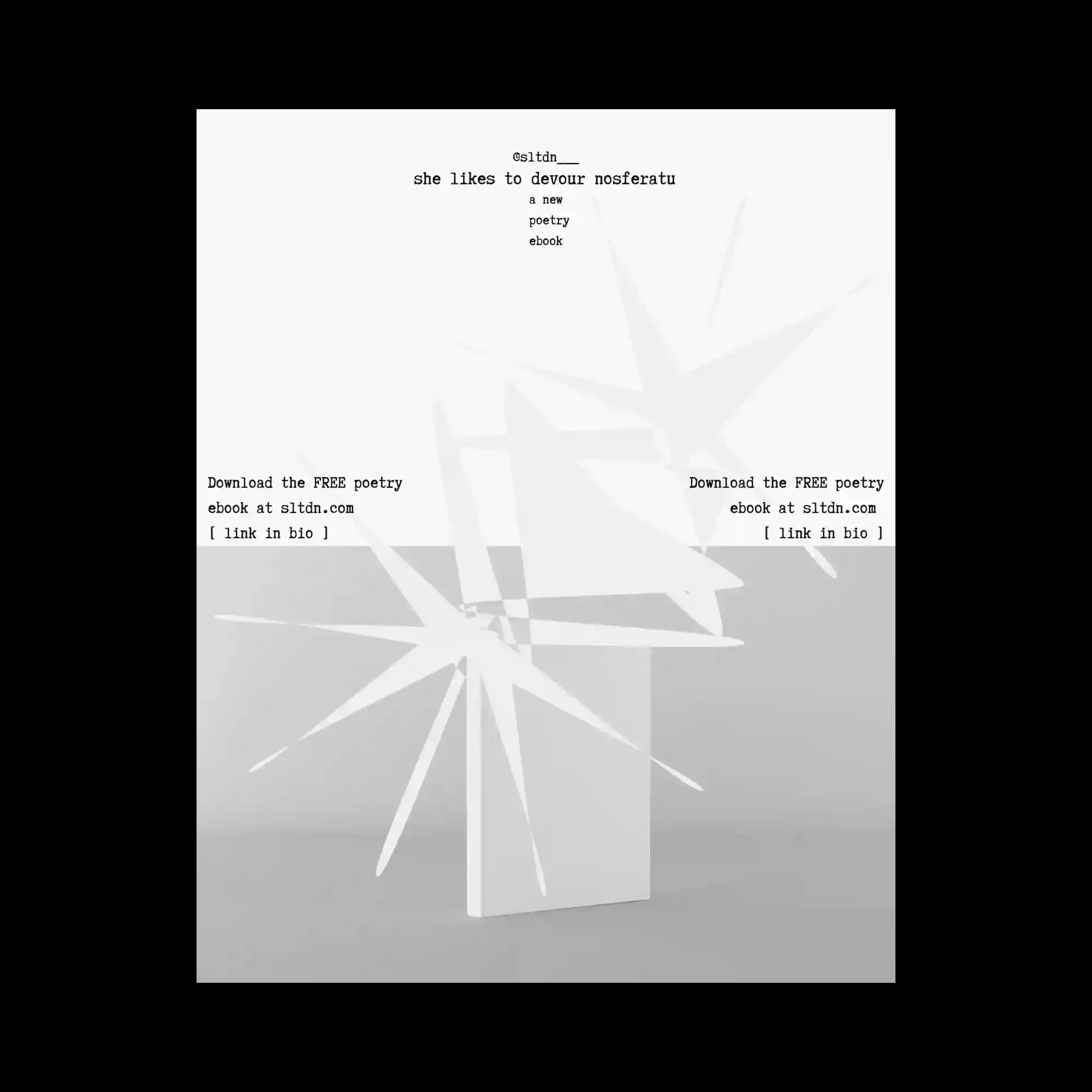 @sltdn___ | A pale monochrome scene shows a geometric object resembling a gift box from which sharp star-like forms radiate outward. The angular shapes appear as rigid paper structures that extend dramatically in multiple directions. Small lines of centered typography float above the object, while mirrored text blocks appear symmetrically on the left and right sides. The minimal grayscale palette highlights the sculptural quality of the radiating forms.