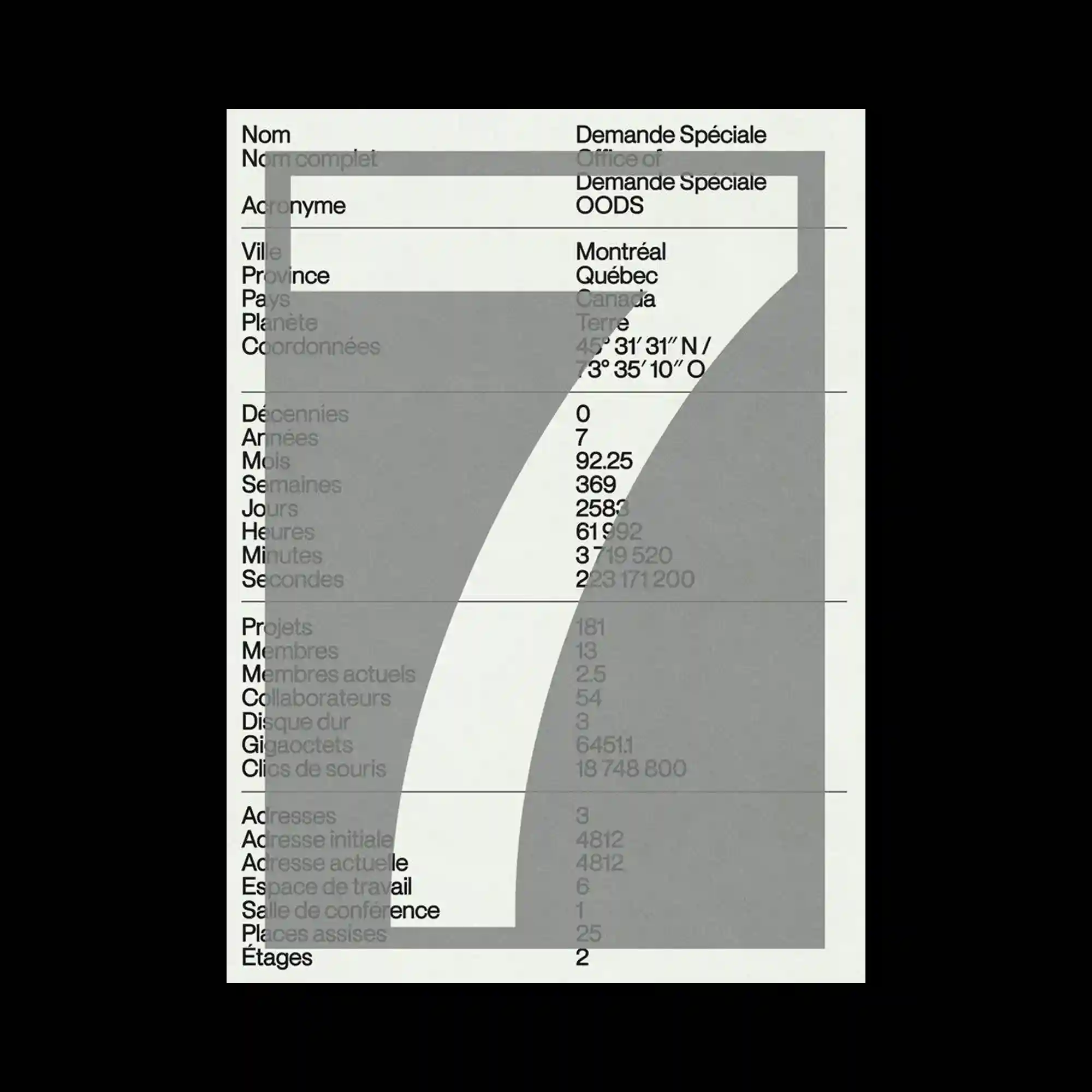 A structured layout resembling an information form fills the composition with rows of aligned text fields. Over this grid, a large translucent numeral spans diagonally across the surface, partially obscuring the underlying information. The muted gray palette and precise typographic alignment reinforce a bureaucratic document aesthetic. The oversized number disrupts the orderly data structure, creating a layered graphic hierarchy.