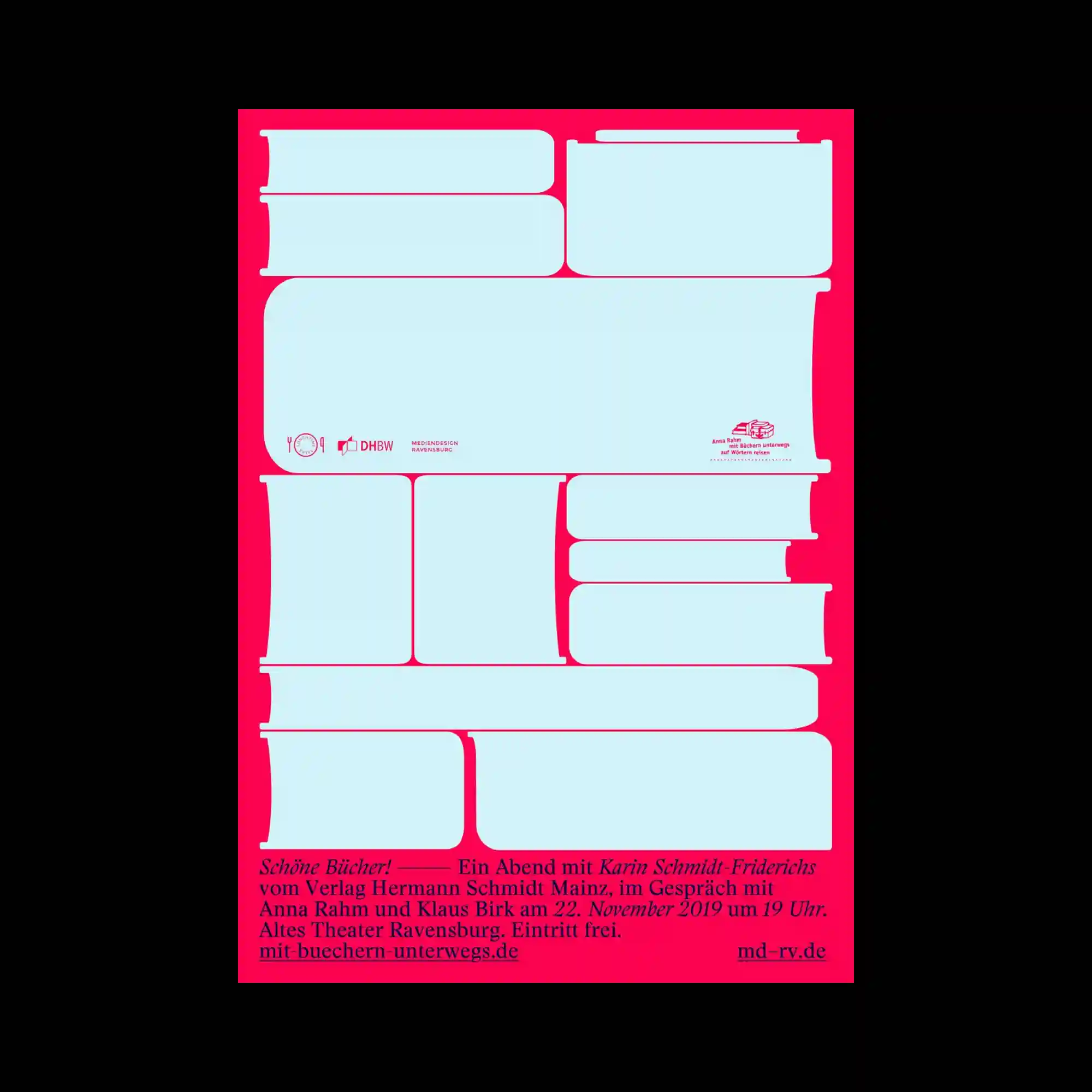 @strg_n | Rounded rectangular blocks resembling simplified book shapes are arranged across the composition in a modular grid. The shapes are filled with pale blue color and sit on a vivid pink background, creating a strong chromatic contrast. Some of the blocks extend horizontally while others stack vertically, forming an irregular but balanced layout. Small typographic elements appear beneath the grid, anchoring the composition with informational detail.