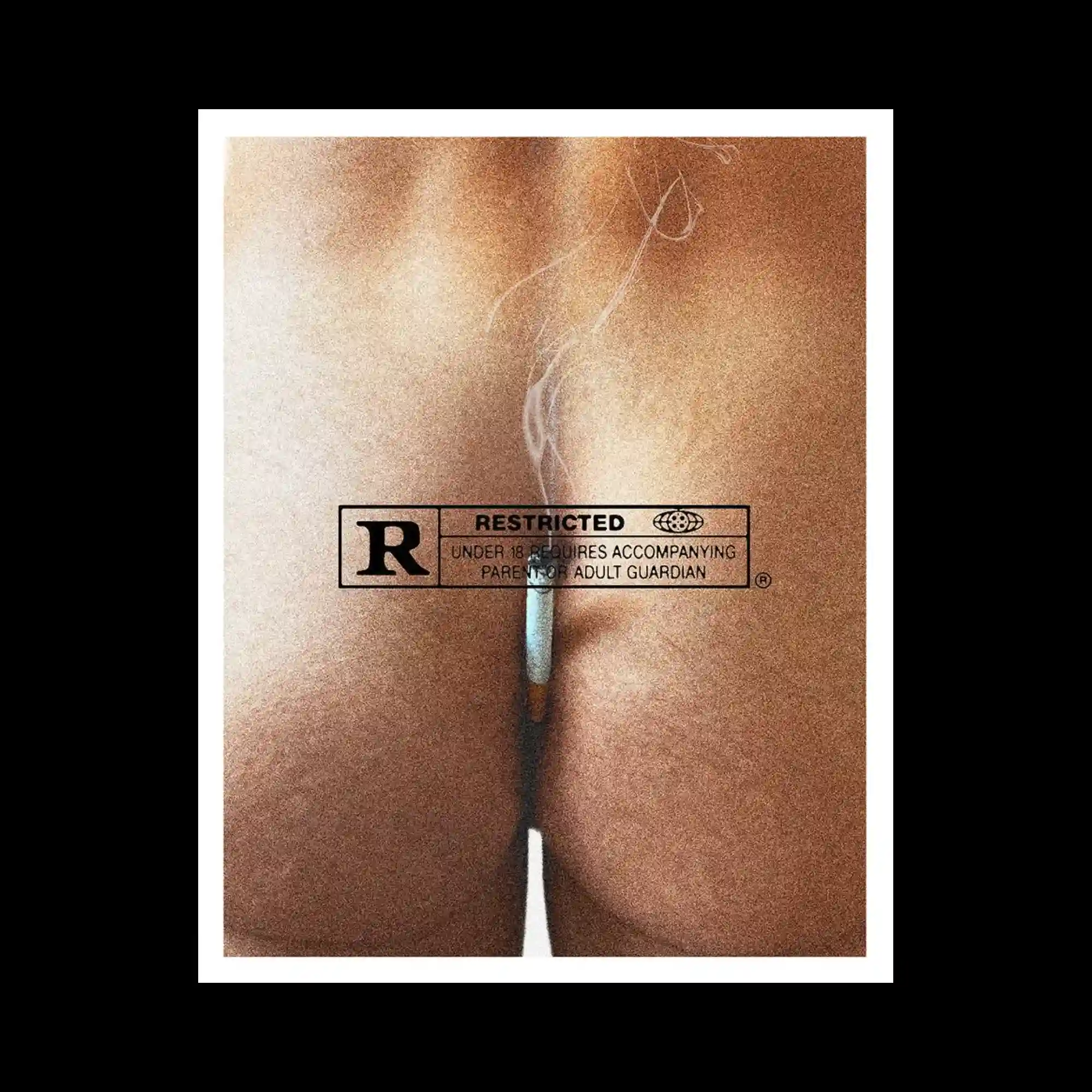 @_tiagodrago | A close-up photographic composition shows two curved surfaces meeting at the center with a cigarette placed vertically between them. A rectangular rating label is positioned across the middle, partially covering the image and creating a graphic overlay effect. The warm tonal lighting emphasizes the texture of the surfaces and the thin trail of smoke rising upward. The juxtaposition of photographic realism and printed label graphics creates a provocative visual contrast.