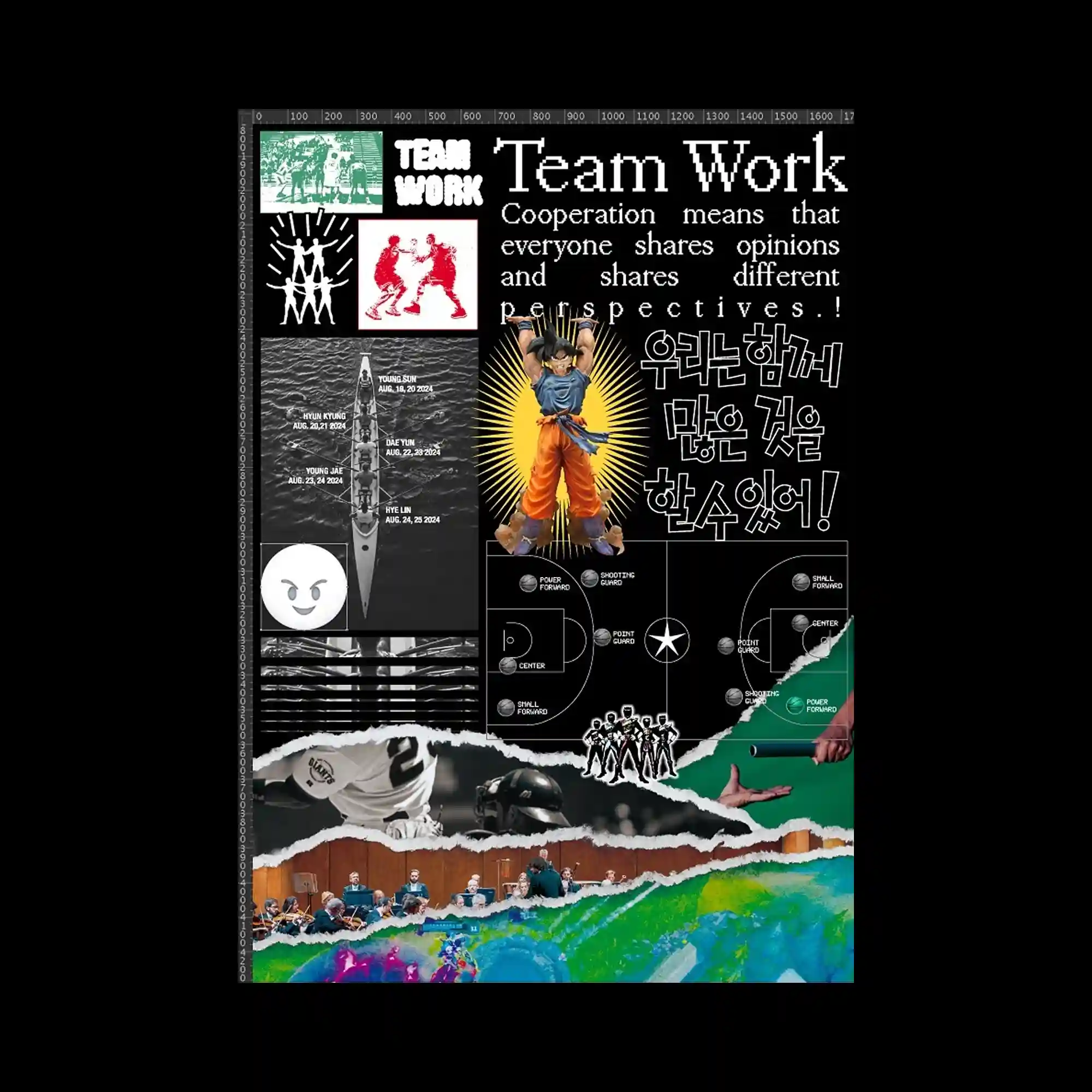 @yoooungsun | A dense collage of photographs, diagrams, and text fragments fills the composition with layered visual information. Images of sports scenes, figures, and graphic symbols are arranged within rectangular panels that resemble a digital editing interface. Bold headings and mixed language typography appear throughout the layout, reinforcing the chaotic visual rhythm. The torn edges of some image layers create a rough transitional boundary between different visual sections.