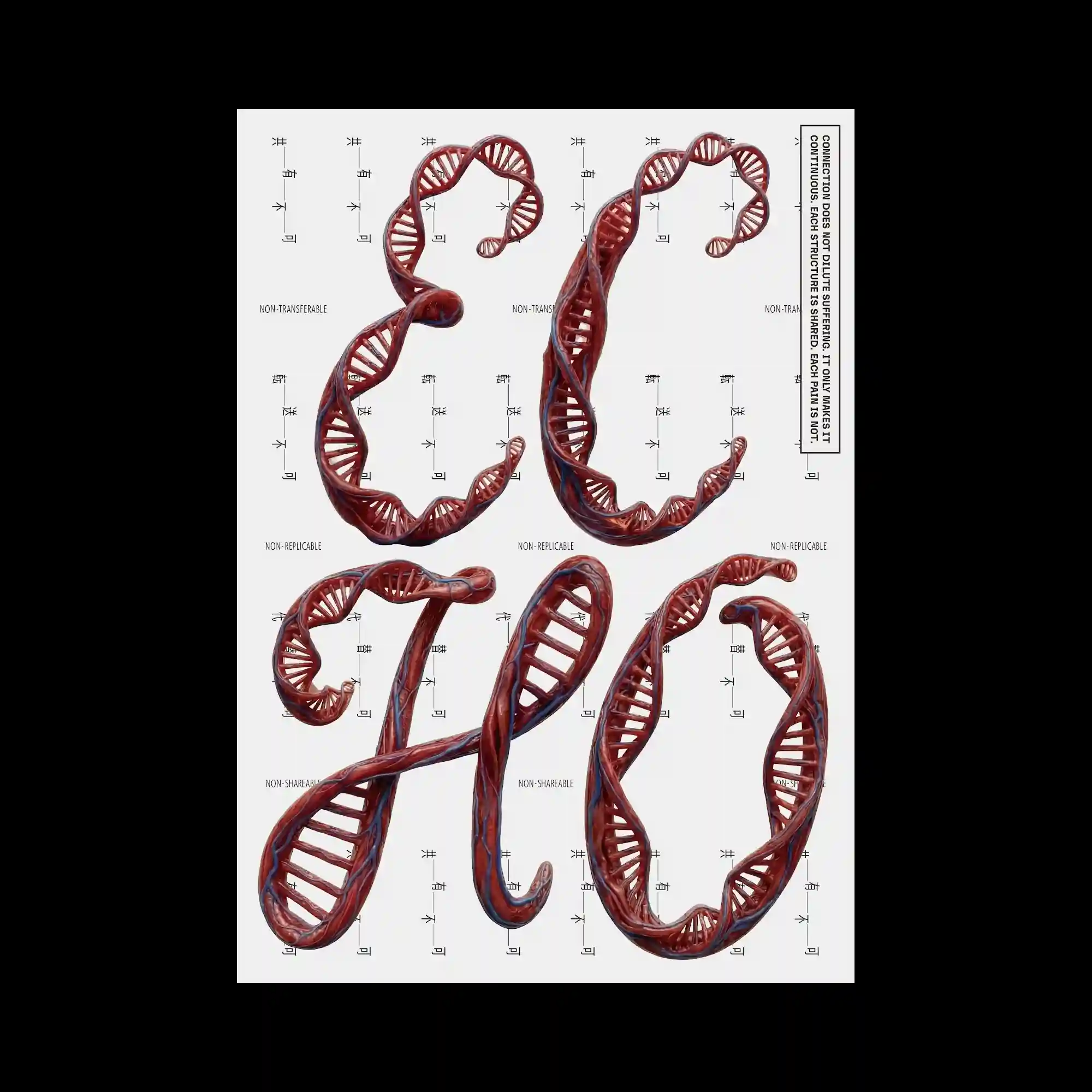 @hiroshi_imaeda | Three-dimensional DNA-like strands twist and curve to form large typographic characters across the poster. The glossy red structures contain repeating ladder-like segments that resemble molecular geometry. Behind the forms, a grid of small repeated characters provides a subtle informational texture. The composition merges scientific imagery with sculptural typography, turning the letters into organic structural forms.