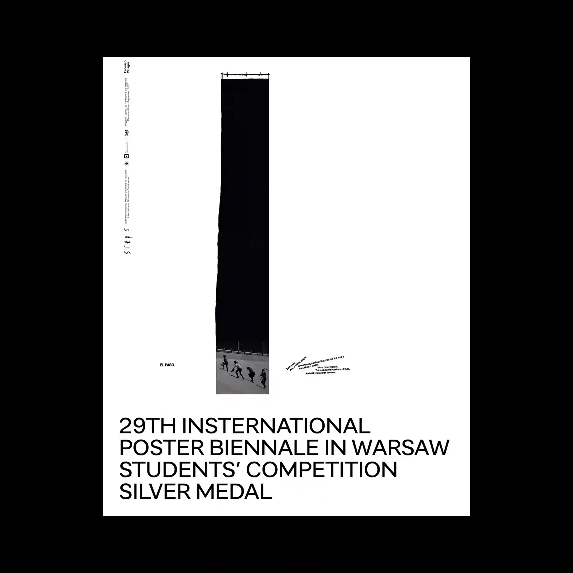 @fffville | A tall vertical black rectangle dominates the center of the poster, acting as a stark visual column. At the base of this column, a small photographic scene shows several figures moving along a slanted surface, creating a sense of scale and distance. Minimal text elements are placed around the composition with large open spaces that reinforce the poster’s conceptual clarity. The contrast between the massive dark shape and the small photographic detail creates a dramatic spatial tension.
