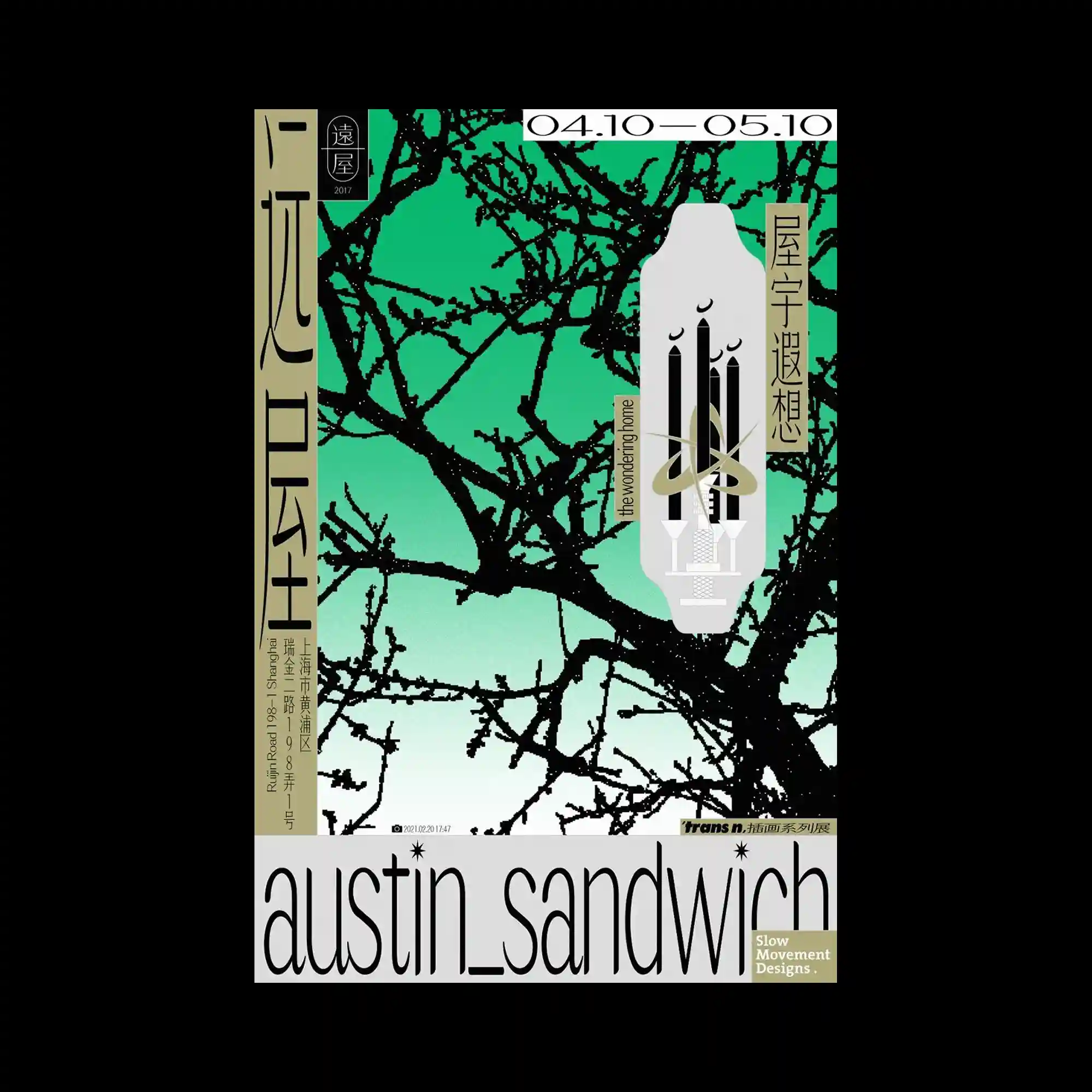 @pangram.pangram | This poster layers bold diagonal typography over a blurred, motion-like photographic background. Rectangular text blocks overlap vertically, creating a sense of compression and tension. The background image appears stretched and smeared, suggesting movement without defining a clear subject. High contrast between sharp type edges and soft, diffused imagery defines the visual hierarchy.