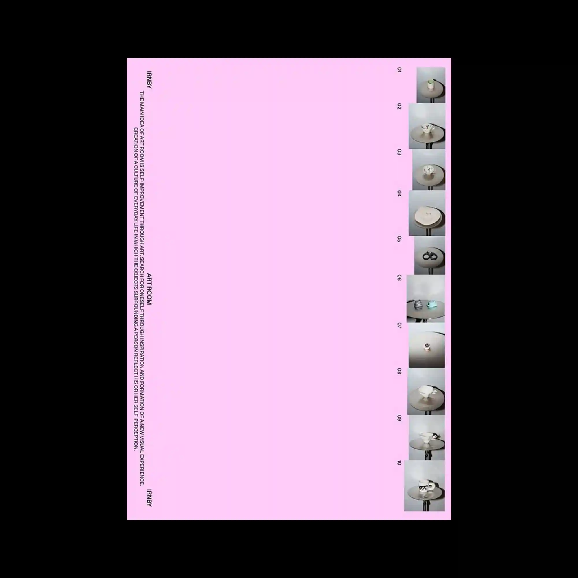 A wide pink field occupies most of the composition while a narrow vertical strip on the right contains a sequence of small photographs. Each image is aligned with a numbered marker, suggesting a chronological or catalog-like arrangement. On the left side, vertically oriented text blocks run along the margin, adding editorial structure. The composition contrasts the expansive color plane with a precise column of imagery.