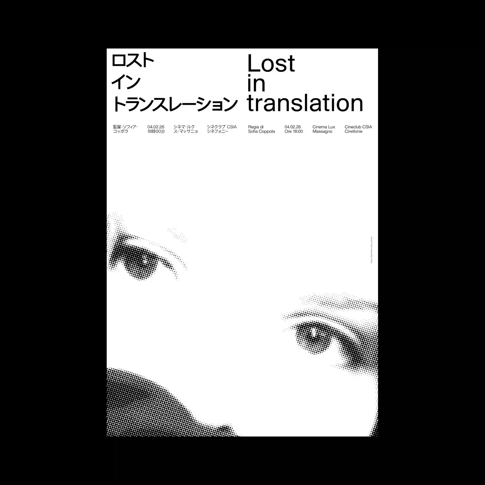 @la_graficata | Minimal typography is placed across the upper portion of the poster, leaving large areas of empty space below. Two halftone images of eyes emerge from the lower corners, rendered in coarse dotted patterns. The stark contrast between sparse text and bold image fragments creates a dramatic visual balance. The composition relies heavily on negative space to direct attention toward the fragmented facial elements.