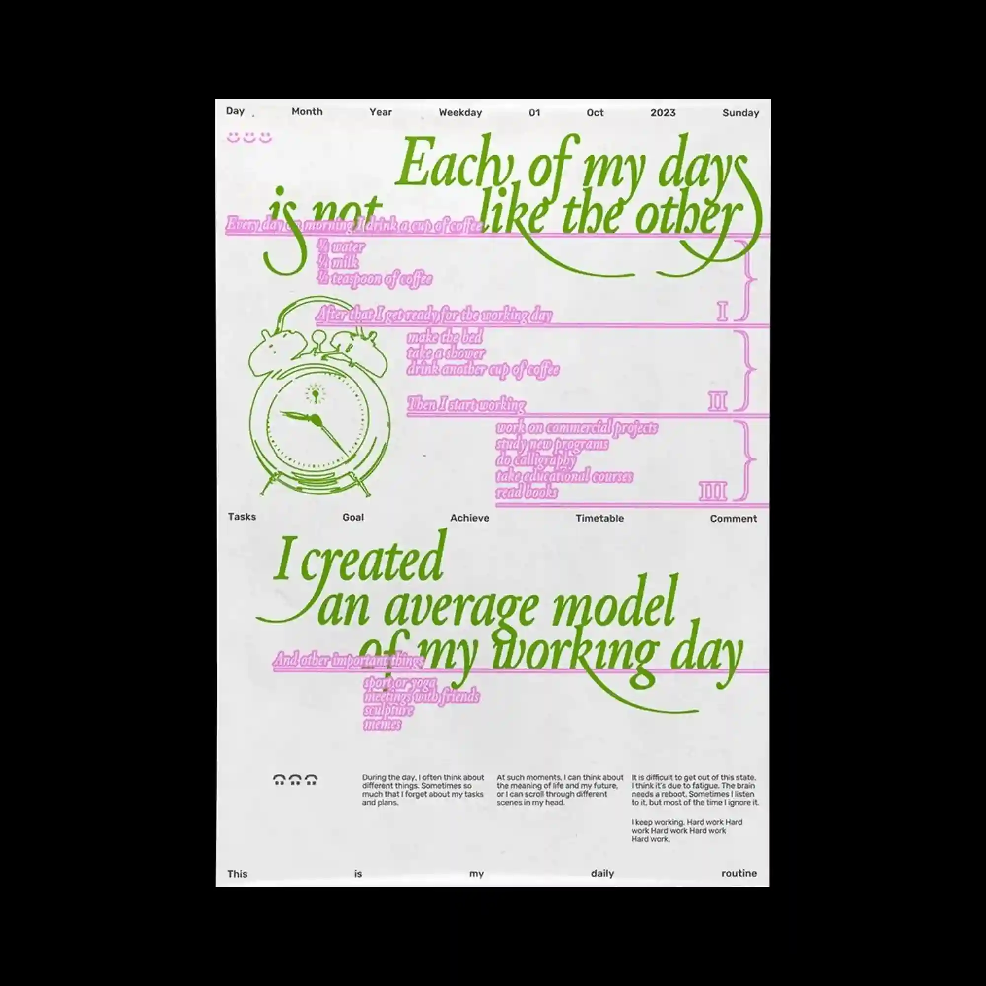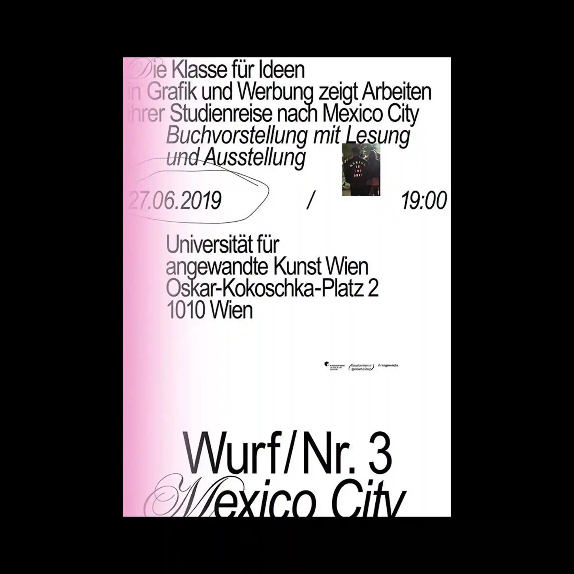 @d____gallo | Large blocks of German text dominate the upper half of the layout, arranged in a clean typographic hierarchy. A vertical gradient band in soft pink appears along the left edge, subtly coloring part of the text. Additional information such as date and time is integrated into the layout with a mix of bold and light typographic weights. The overall composition emphasizes clarity and structure while introducing a gentle color accent.