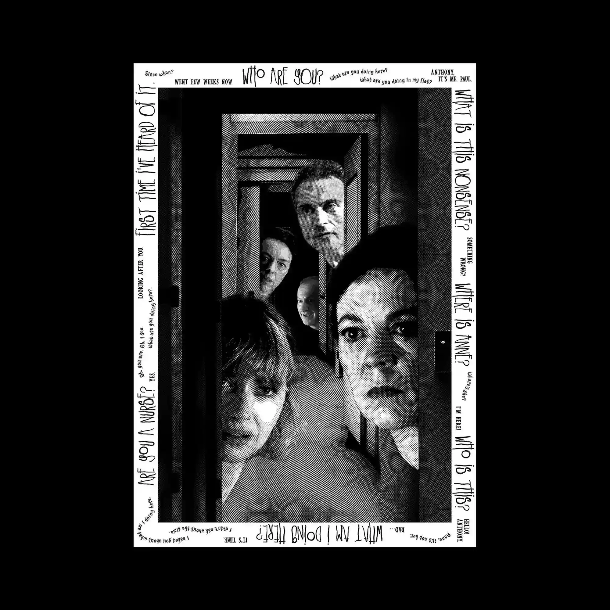 @yeryn.ahn | A black-and-white photographic composition shows several faces appearing within a narrow doorway-like frame. The image uses strong contrast and halftone textures, emphasizing facial expressions and depth within the layered interior space. Around the image, handwritten-style typography runs along the borders, forming a frame of scattered textual fragments. This combination of documentary photography and expressive marginal text creates a tense and narrative visual atmosphere.