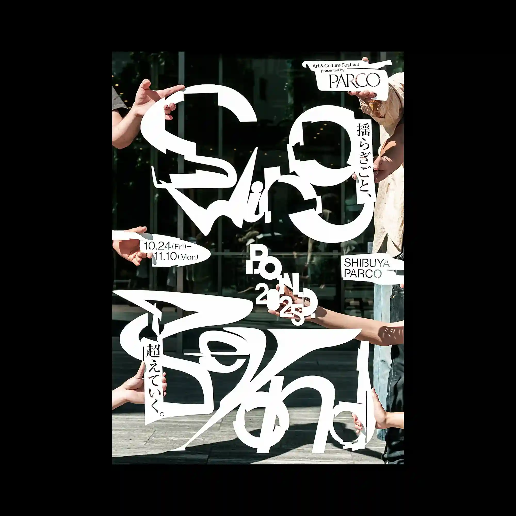 @postcityboy | Large white typographic forms dominate the composition, their exaggerated curves and angular cuts overlapping and interlocking across the surface. Multiple human hands extend from the edges of the frame, holding or presenting the individual letter fragments as if assembling a fragmented typographic structure. Smaller labels and directional shapes containing compact text are scattered around the composition, adding informational accents that contrast with the oversized lettering. The combination of photographic elements and bold typographic cutouts creates a dynamic collage where the letters function both as graphic shapes and structural components.