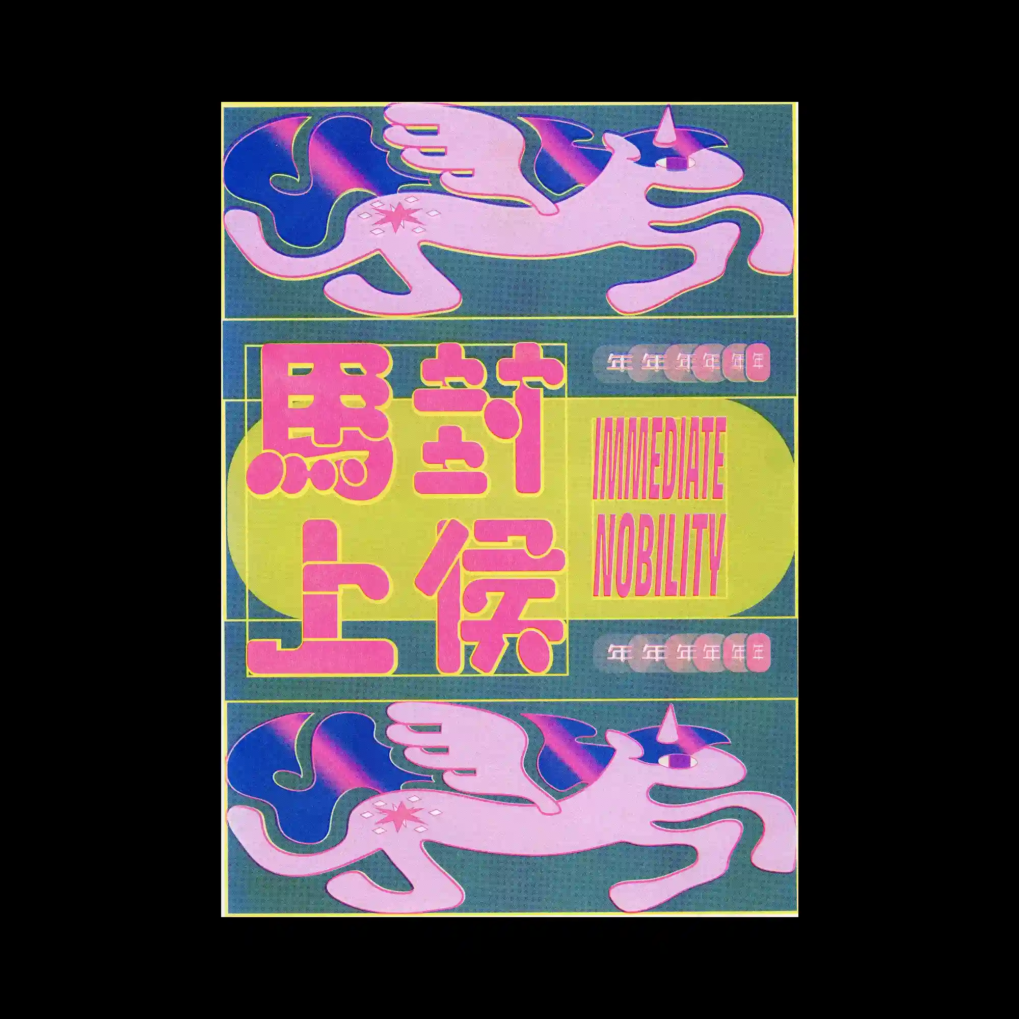 @vvkwokk | A stylized winged unicorn illustration runs horizontally across the upper and lower sections of the composition, creating a mirrored visual rhythm. Bright pink and purple tones define the character’s body and flowing mane, while bold outlines enhance the graphic silhouette. The center of the layout features large blocky characters layered over a rounded rectangular shape filled with vibrant yellow. Surrounding grid lines and small decorative symbols introduce a structured framework that contrasts with the playful illustrated figure.