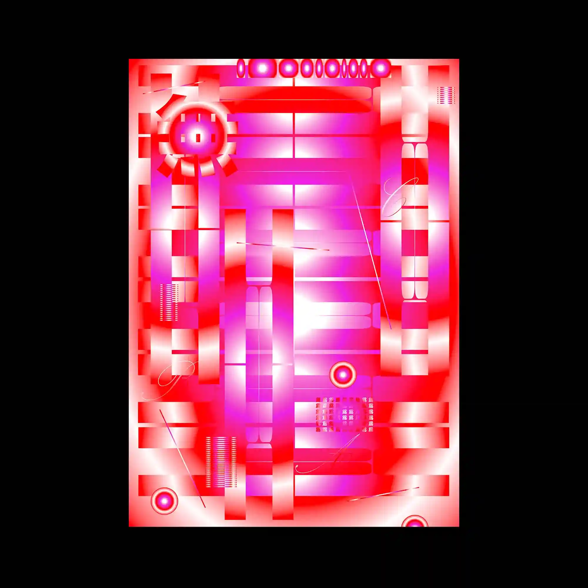 @charleslin.studio | This poster is constructed from a dense arrangement of geometric modules that resemble mechanical or architectural components. Rounded capsules, cylindrical bars, and circular nodes repeat across the grid, creating a complex network of symmetrical and mirrored structures. The color palette is dominated by intense reds and magentas with bright white highlights that give the forms a luminous, almost metallic appearance. Thin lines and small graphic details are scattered across the surface, adding a sense of circuitry and technical precision.