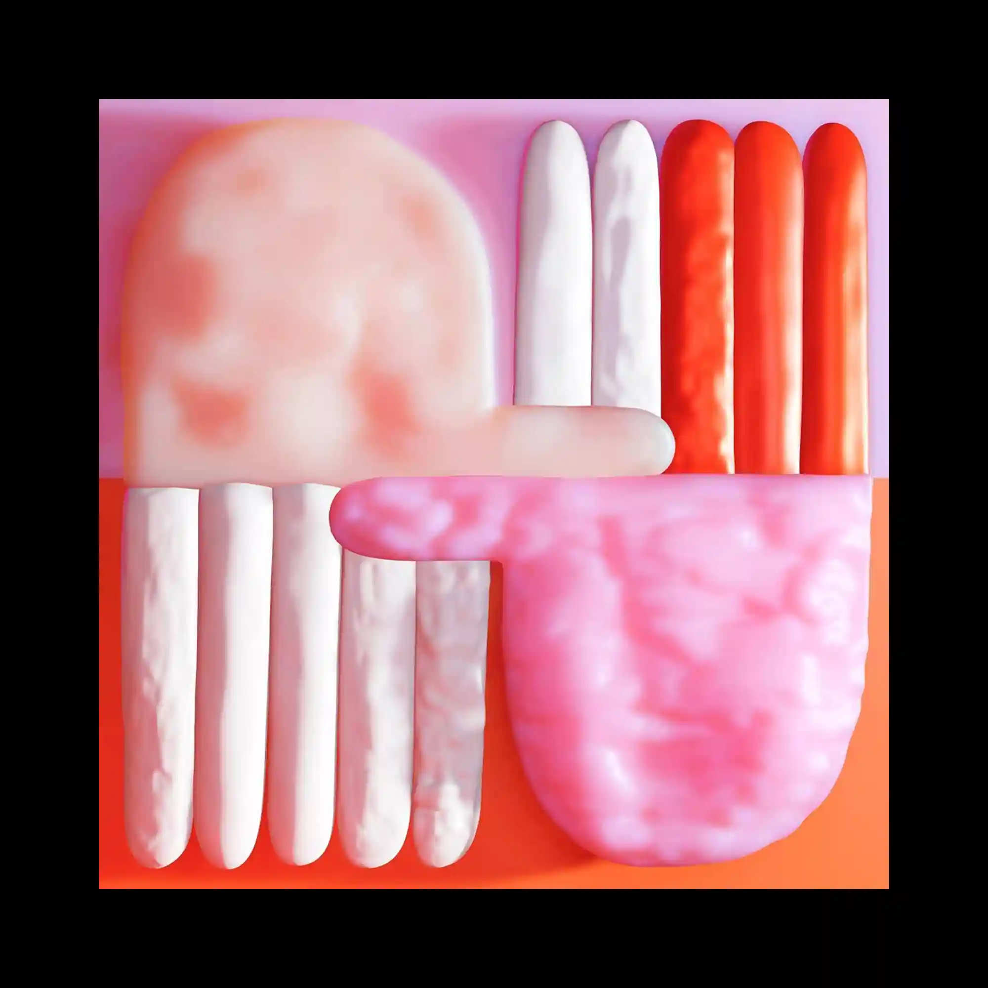 @studiokronschnabl | A set of rounded tubular forms fills the composition, arranged in parallel vertical rows and horizontal intersections. The shapes appear glossy and inflated, with smooth gradients shifting between white, pink, and bright red tones. One large dome-like form contrasts with elongated cylindrical elements that repeat rhythmically across the structure. The overall arrangement resembles a sculptural abstract system built from soft, inflated modules.