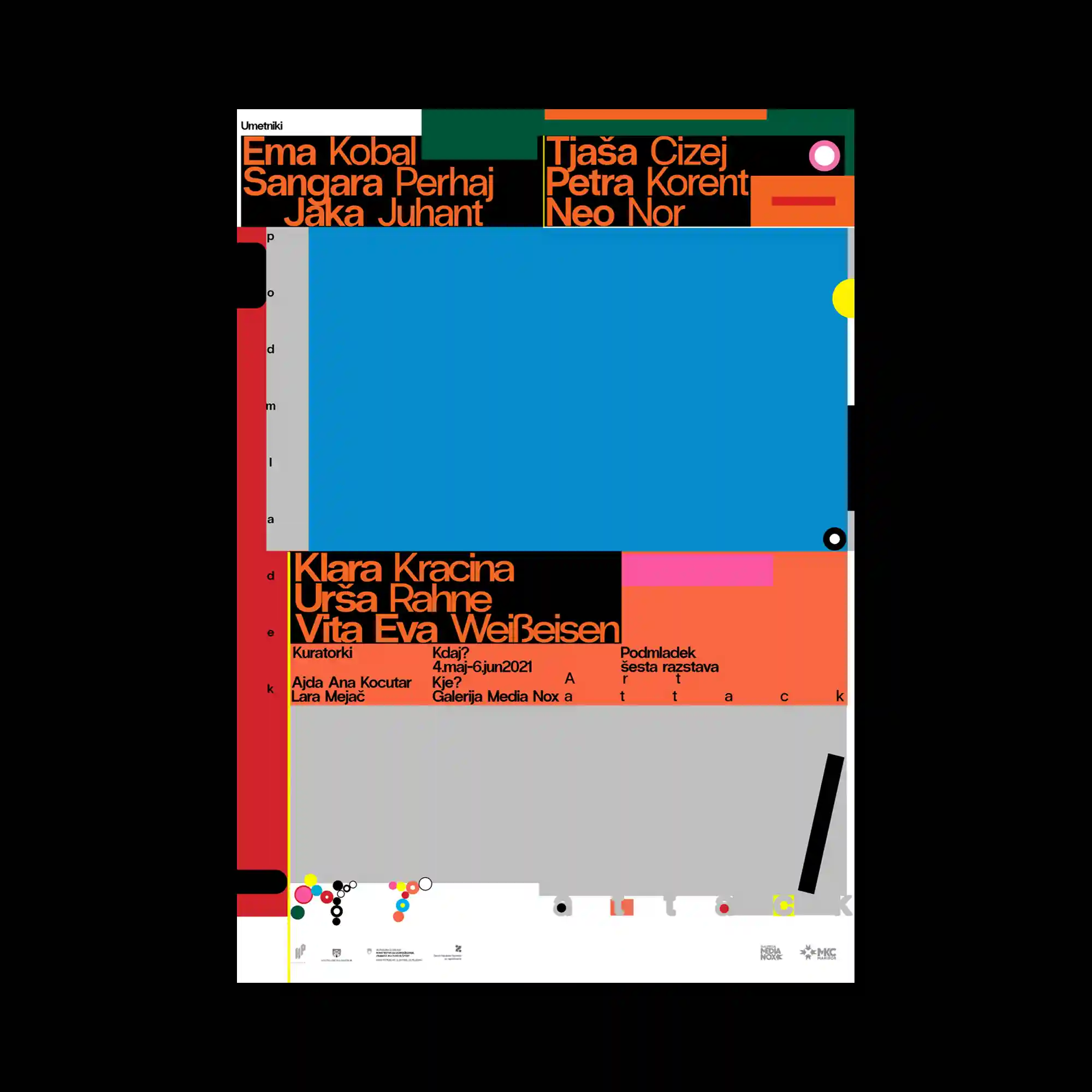 @podmladek | A layered poster composition combines bold typographic blocks, geometric color fields, and overlapping rectangular planes to create a dense and dynamic layout. Bright orange text set in a heavy sans-serif typeface contrasts sharply against darker backgrounds, forming strong visual anchors across the composition. A large central blue rectangle interrupts the underlying layers, partially obscuring text and creating depth through occlusion. Additional graphic elements, including small circular accents and fragmented shapes, introduce playful tension and reinforce the collage-like structure.