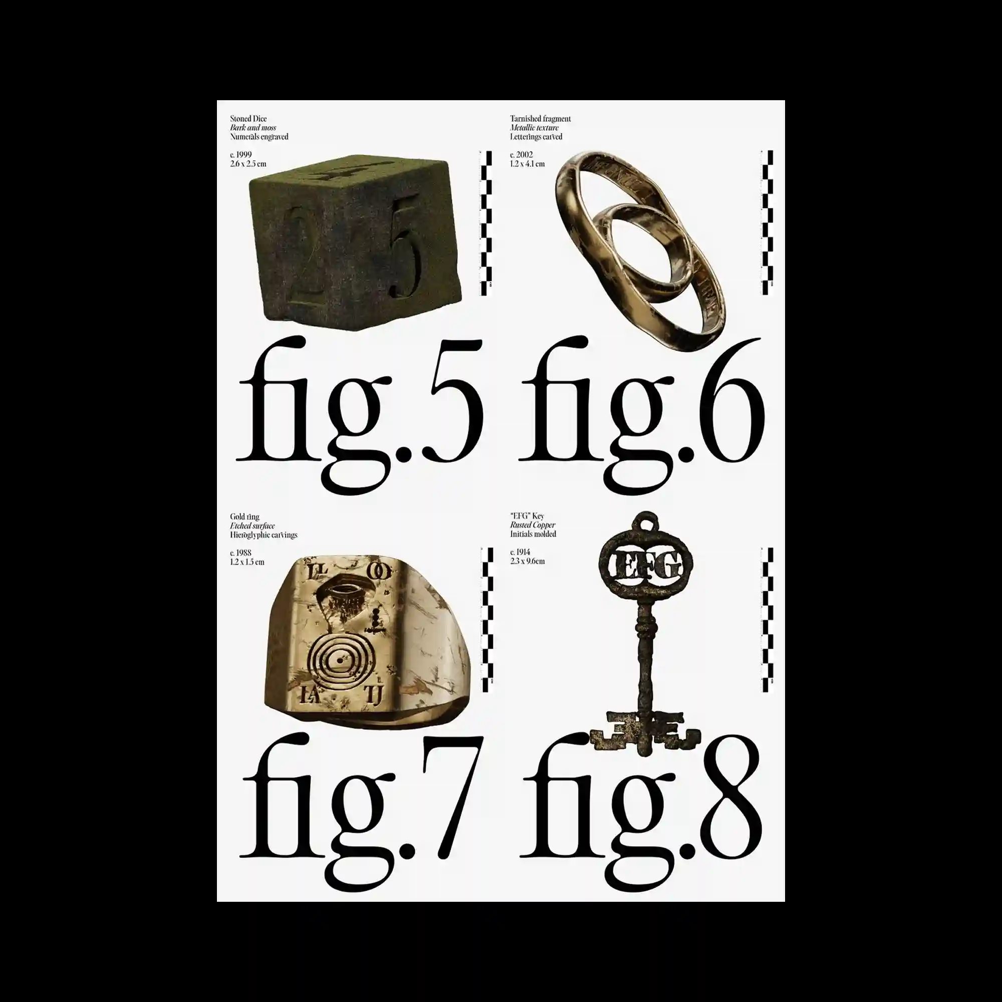 @pangram.pangram | A grid-based composition organizes four distinct object images, each positioned in a quadrant and paired with oversized serif typography reading “fig.5” through “fig.8.” The contrast between the refined, high-resolution object photography and the exaggerated scale of the type creates a strong visual hierarchy that anchors each section. Fine typographic details, including small descriptive captions and measurement-like annotations, introduce a scientific or archival tone. Vertical black-and-white marker-like elements along the sides further reinforce a cataloging aesthetic while adding rhythm to the layout.