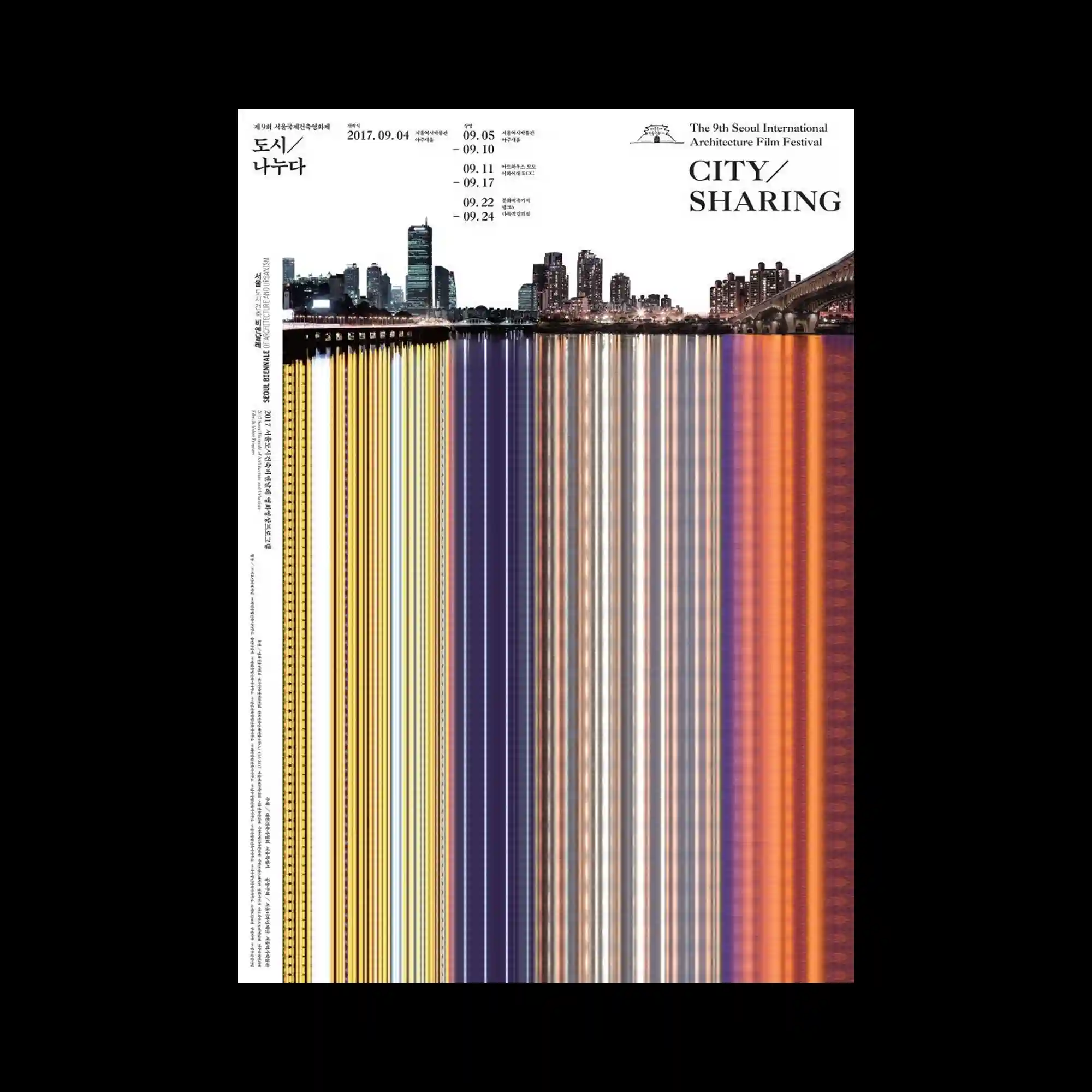 @bokdo.walks | The composition juxtaposes a panoramic cityscape with a vertically stretched abstraction derived from its reflection, transforming horizontal urban lights into elongated color bands. The upper section retains a crisp photographic skyline, while the lower portion compresses and repeats luminous data into dense vertical stripes. This contrast creates a tension between representational imagery and systematic distortion, emphasizing rhythm and continuity. Typography is sparsely positioned around the edges, allowing the visual transformation to dominate the layout.