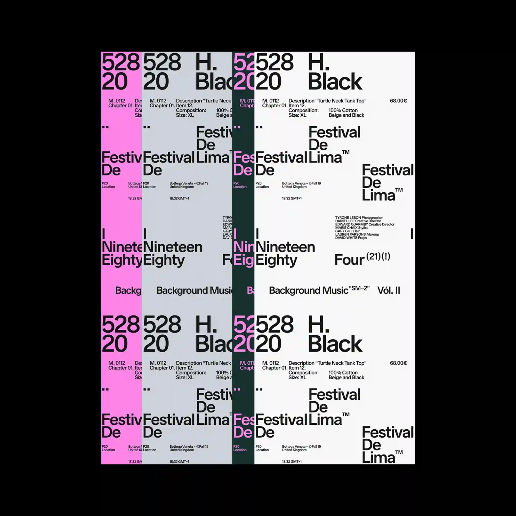 The layout fragments typographic content into overlapping vertical panels, creating a layered collage of repeated information blocks. Bold sans-serif text is duplicated and partially masked, generating a sense of motion and temporal offset across the composition. Color strips act as separators while also disrupting readability, reinforcing the experimental structure. The overall system prioritizes rhythm, repetition, and interference over clarity.