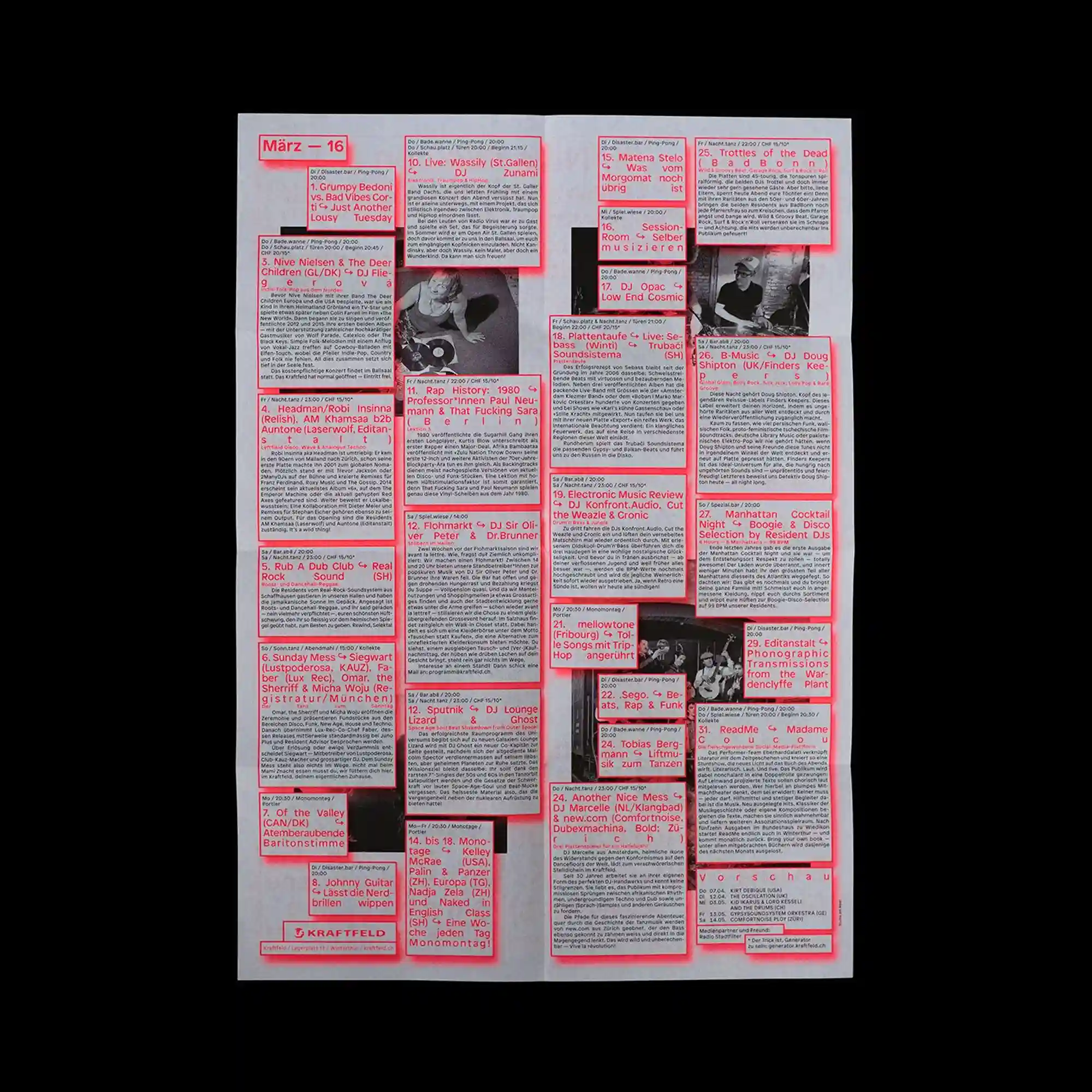@studio.am.meer | The poster adopts a dense editorial grid filled with numerous text blocks, each enclosed within high-contrast frames that segment information. Red outlines unify the composition while guiding the eye through a structured yet overwhelming flow of content. Interspersed grayscale images introduce pauses within the text-heavy layout, balancing density with visual breaks. The hierarchy emerges through grouping rather than scale, relying on repetition and modular spacing.