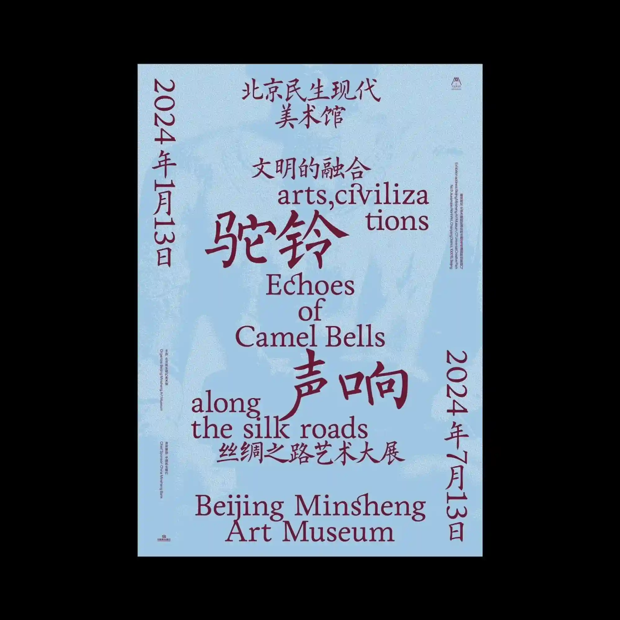 @msam_beijing | The composition centers on expressive multilingual typography, where large-scale characters interact dynamically with smaller Latin text. Deep red lettering contrasts against a muted background, establishing a strong visual anchor. The arrangement appears intentionally irregular, with text blocks shifting in orientation and scale to create a sense of cultural layering. Fine grain texture overlays the surface, adding depth and a tactile quality to the otherwise flat layout.