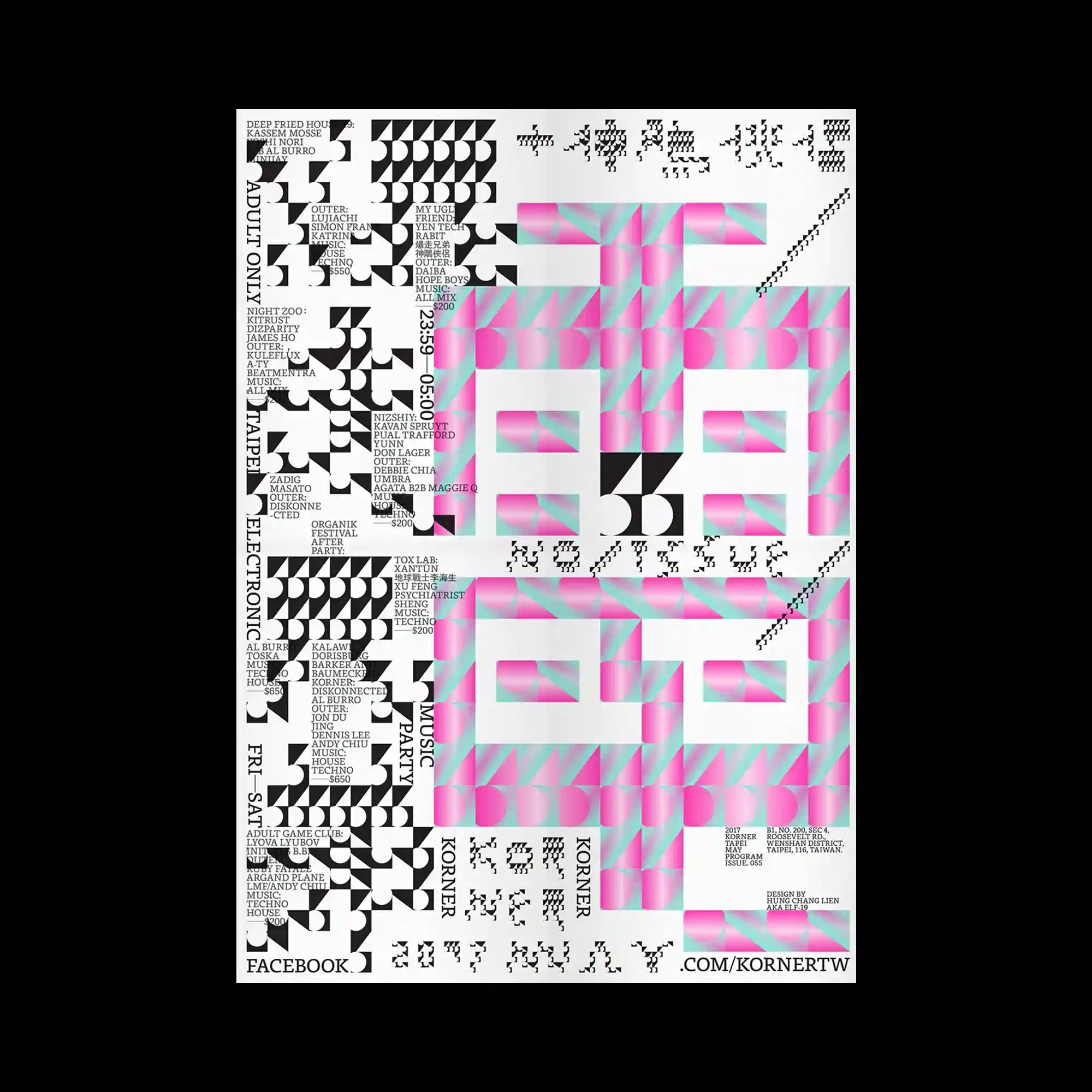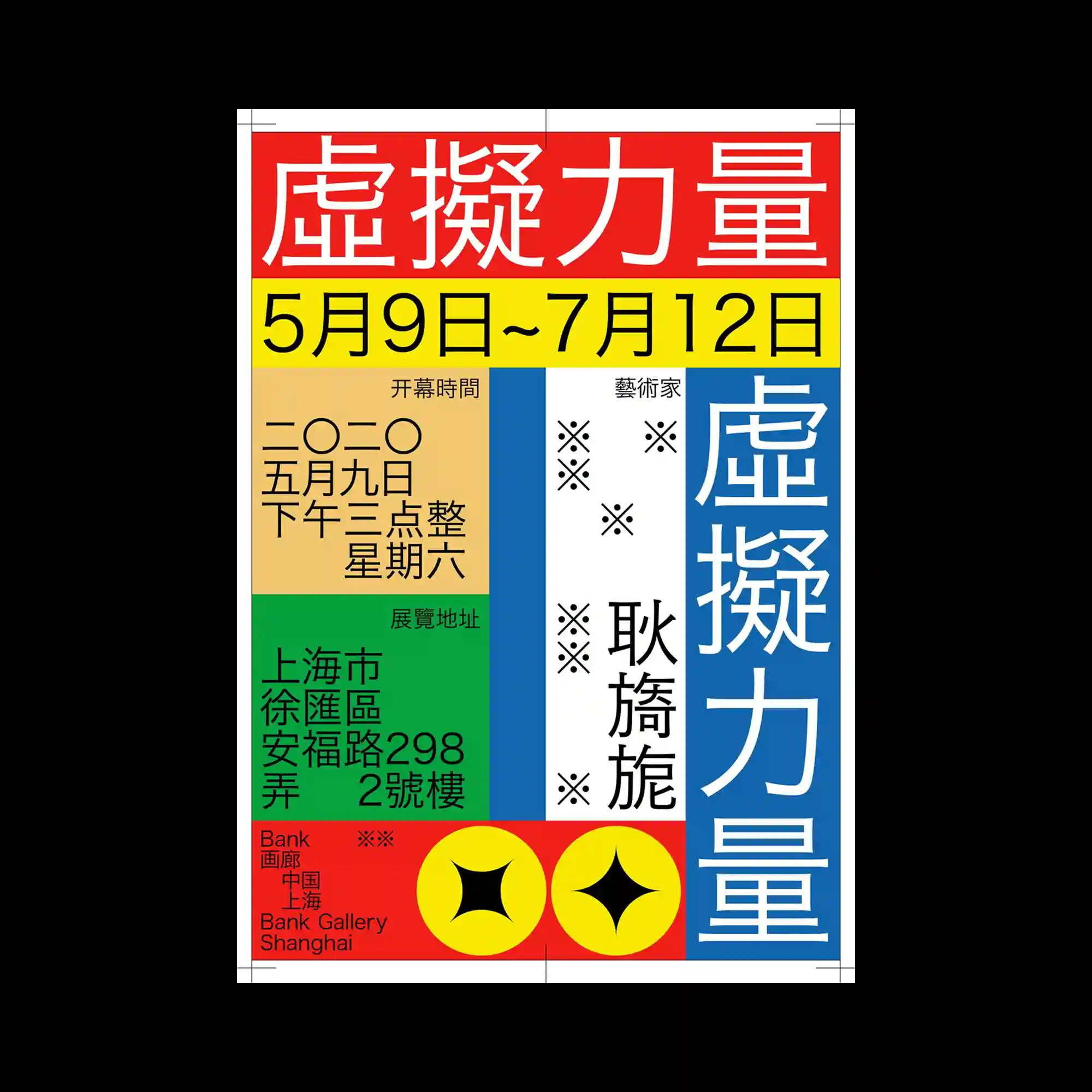 @bankmabsociety | A rigid grid-based composition divides the poster into multiple rectangular zones filled with highly saturated primary and secondary colors, creating a strong visual hierarchy through contrast. Large-scale Chinese typography dominates both horizontal and vertical orientations, interacting with smaller informational text blocks arranged in tightly structured columns. Decorative symbols and geometric icons are sparsely placed, acting as visual pauses within the dense typographic system. The overall layout emphasizes modular segmentation, where each color block functions as an independent yet interconnected information unit.
