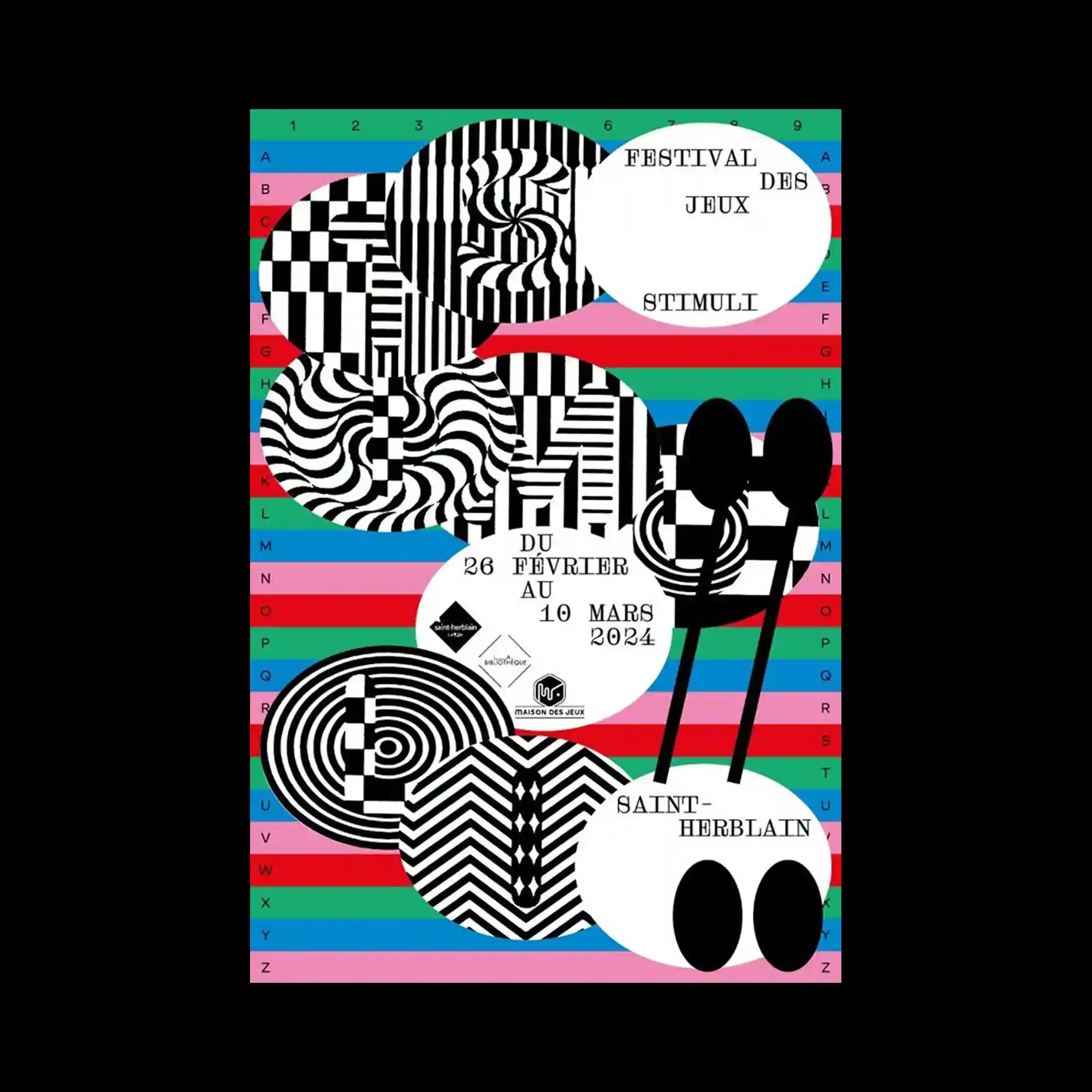 @choquelegoff | The composition layers multiple circular and organic shapes filled with high-contrast black-and-white optical patterns, generating strong visual vibration and depth. These patterned forms overlap against a background of horizontal color bands, producing a dynamic interplay between flat color and illusionistic texture. Text elements are contained within white shapes, floating above the composition and providing structured information zones. The contrast between rigid typographic placement and fluid patterned forms creates a tension between order and visual distortion.