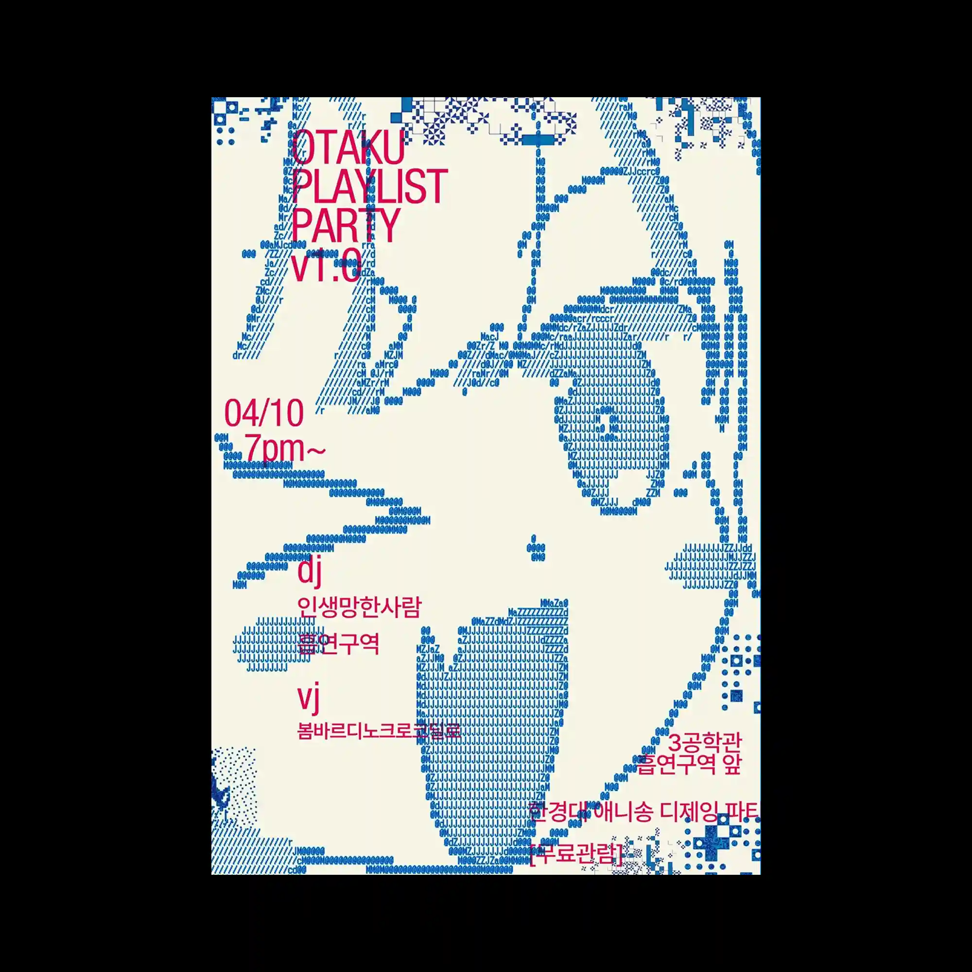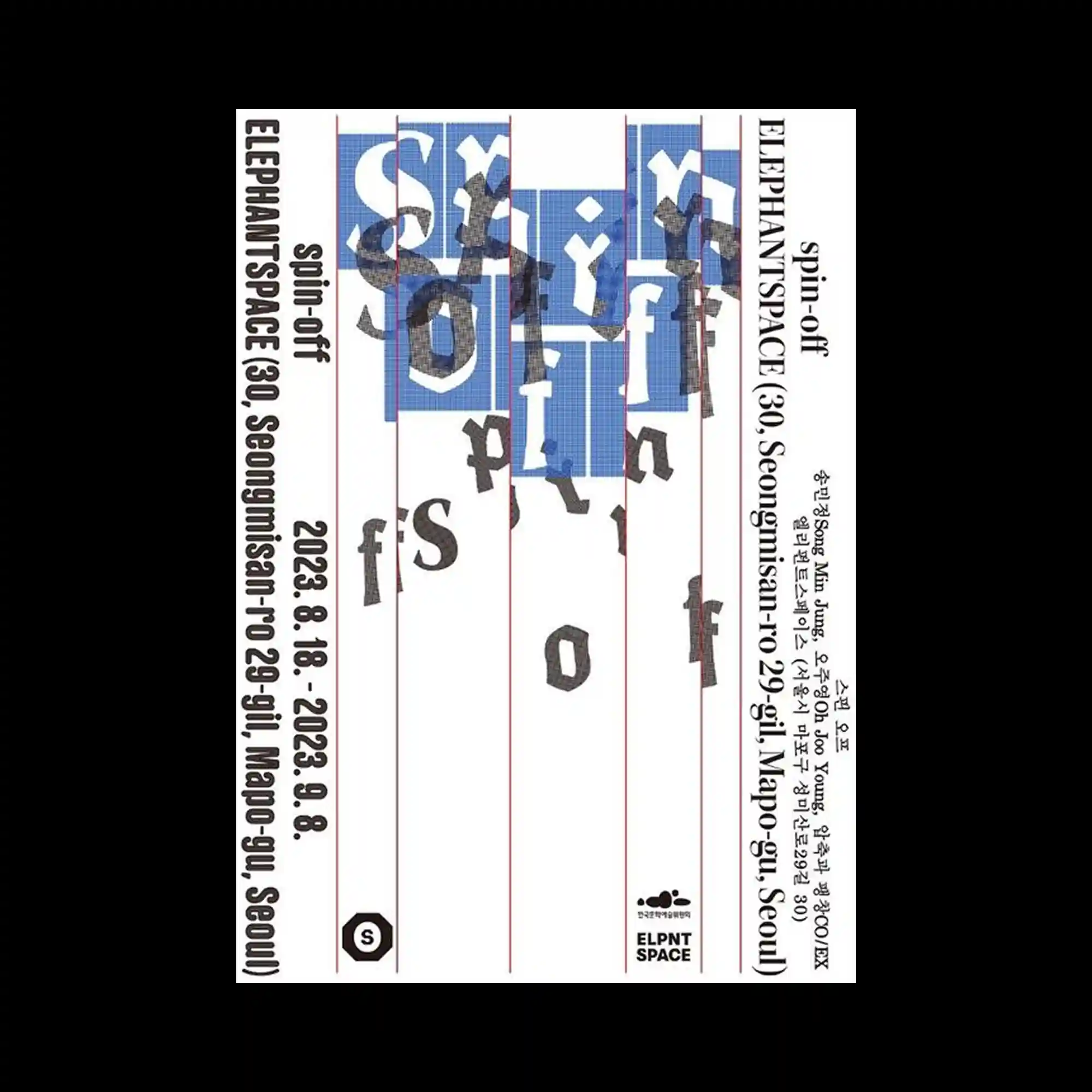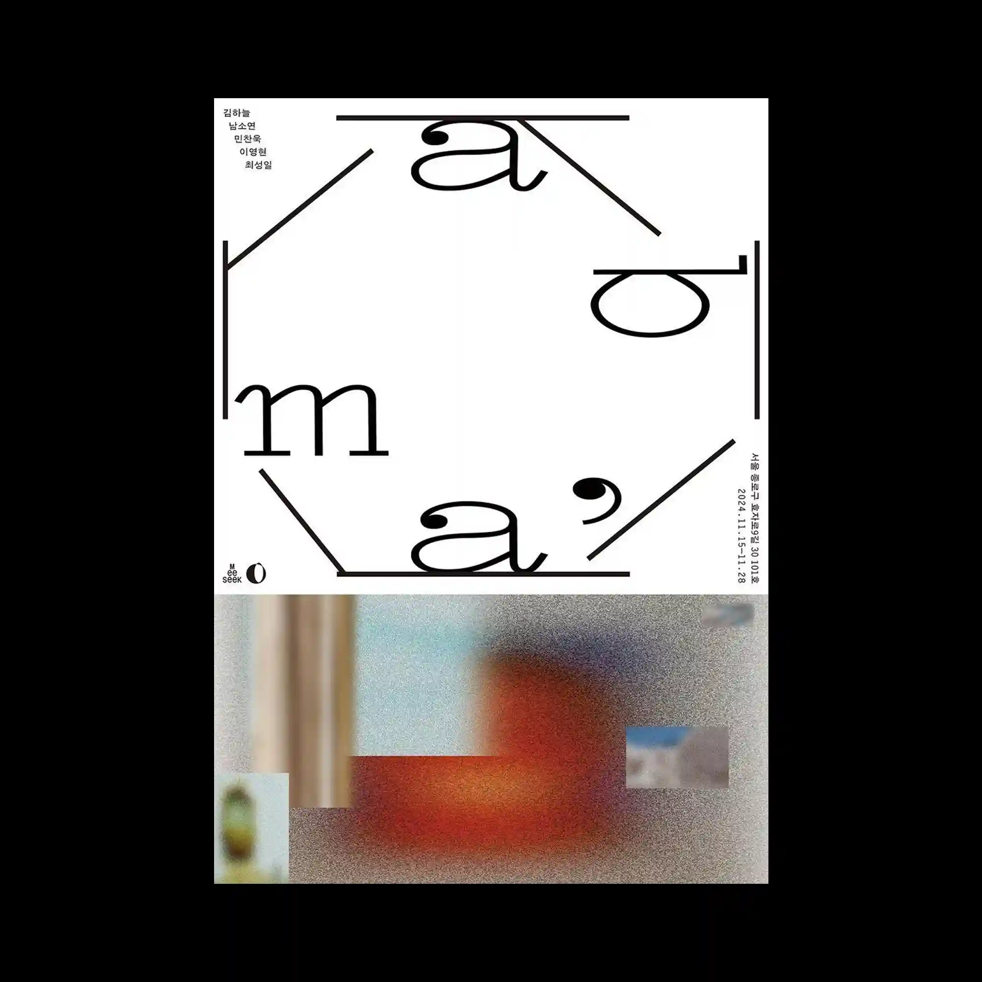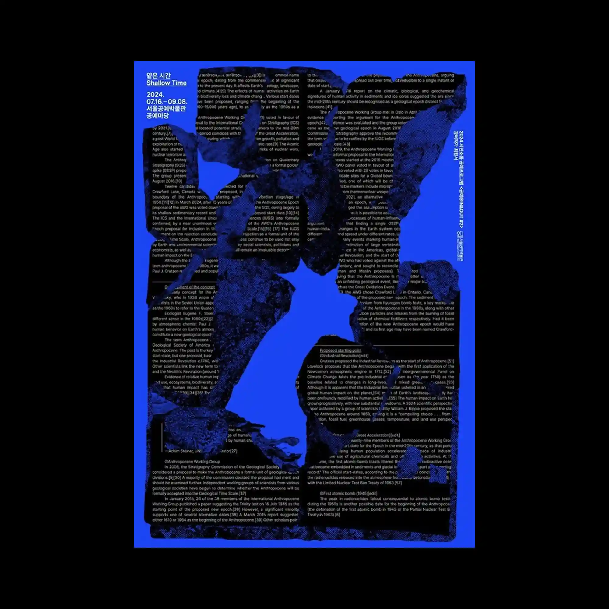 Large bilingual typography frames the poster, with Korean and English text forming a rectangular border around the central image area. Inside the frame, a textured grayscale image appears fragmented by dark rectangular blocks that interrupt the surface. Additional text and symbols run vertically and horizontally along the edges, creating a layered editorial layout. The interplay of solid black shapes and distressed textures introduces a sense of visual disruption.