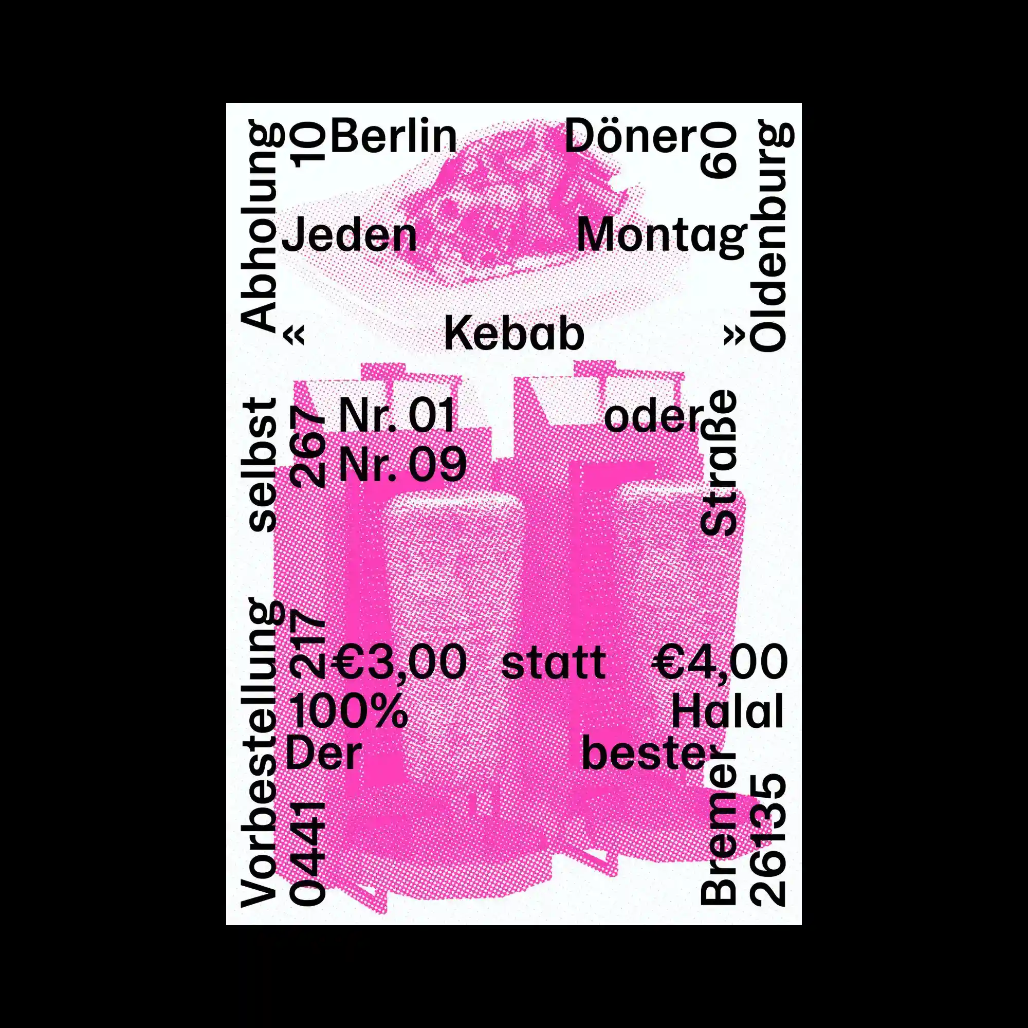 @khalitzburg | A halftone-rendered photographic image is overlaid with scattered typographic elements arranged in multiple orientations, creating a collage-like composition. The monochromatic pink texture contrasts with sharp black text, enhancing legibility while maintaining visual tension. Text blocks are rotated and positioned along the edges, breaking conventional reading flow and forming a perimeter-based layout. The composition balances image and typography through controlled overlap and spatial disruption.