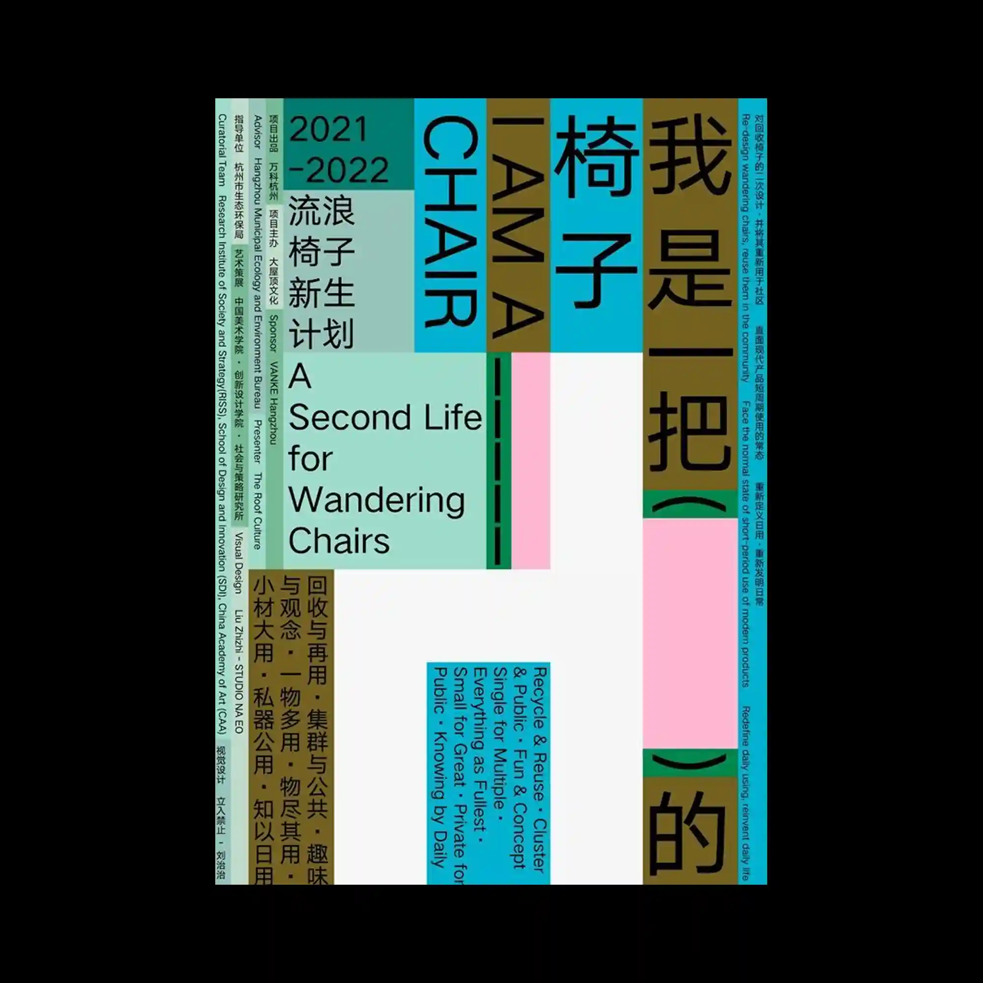 Bold blocks of color divide the layout into horizontal bands containing dense multilingual text. Large Chinese characters appear prominently at the top and bottom, while smaller information lines occupy the central sections. The poster mixes typographic hierarchies with contrasting background colors such as blue, yellow, red, and black. This layered arrangement emphasizes informational density and strong graphic segmentation.