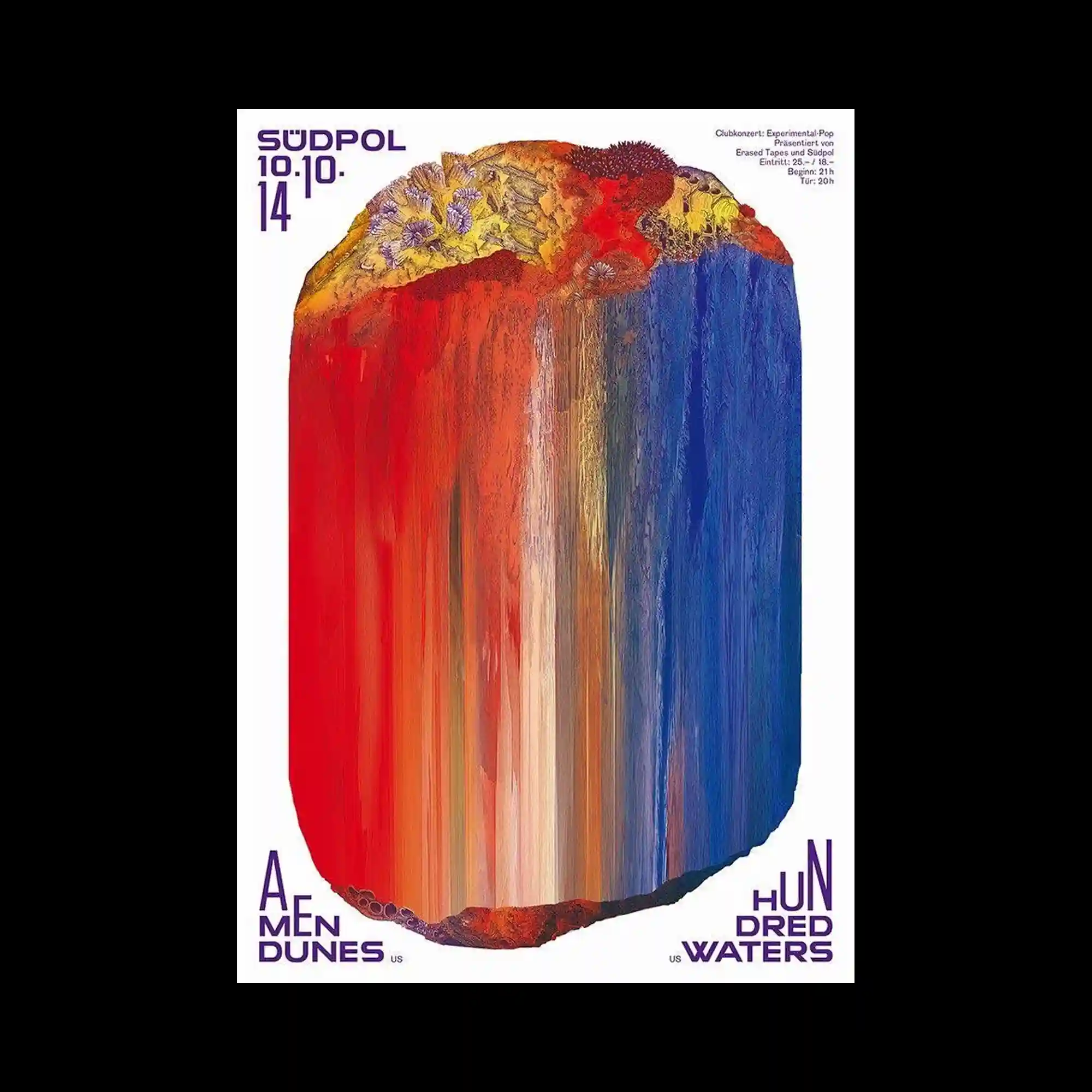 A central textured form resembling a solid mass is rendered with vertical color streaks that transition from warm to cool tones, creating a gradient-like flow. The top surface features intricate organic details, contrasting with the smooth vertical motion of the colors below. Minimal typography is placed around the edges, allowing the central form to dominate the composition. The design emphasizes materiality and motion through the interaction of texture and directional color blending.