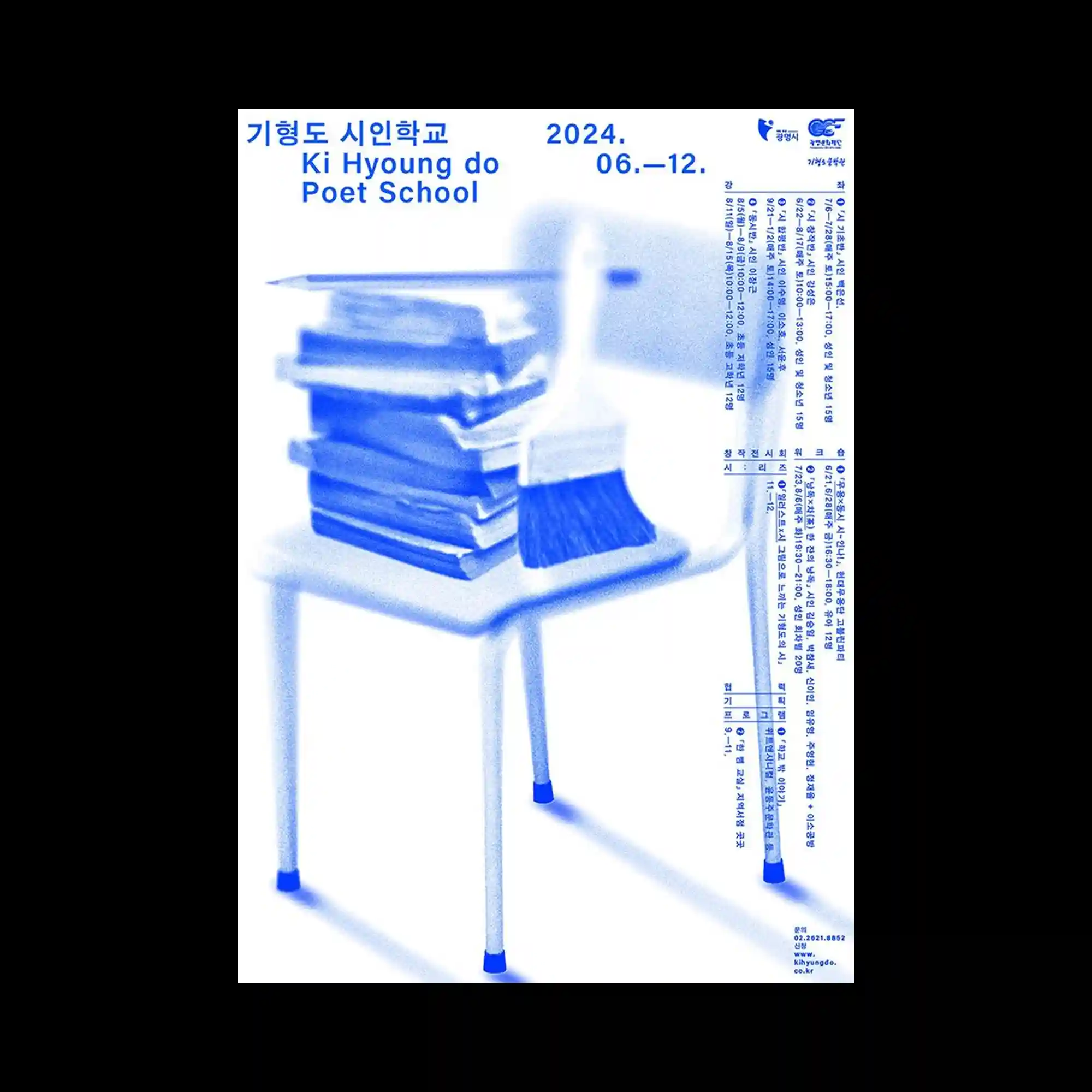 A monochromatic blue-tinted image of stacked objects and a brush is rendered with a soft, diffused texture that reduces sharp detail and creates a hazy visual atmosphere. The composition places the object centrally while thin, structured typographic blocks align along the top and right edges, forming a strict informational frame. The contrast between the blurred photographic texture and the crisp sans-serif typography establishes a dual-layered visual language. The overall layout emphasizes emptiness and softness, allowing the image to dissolve into the surrounding space while maintaining structural clarity through text alignment.