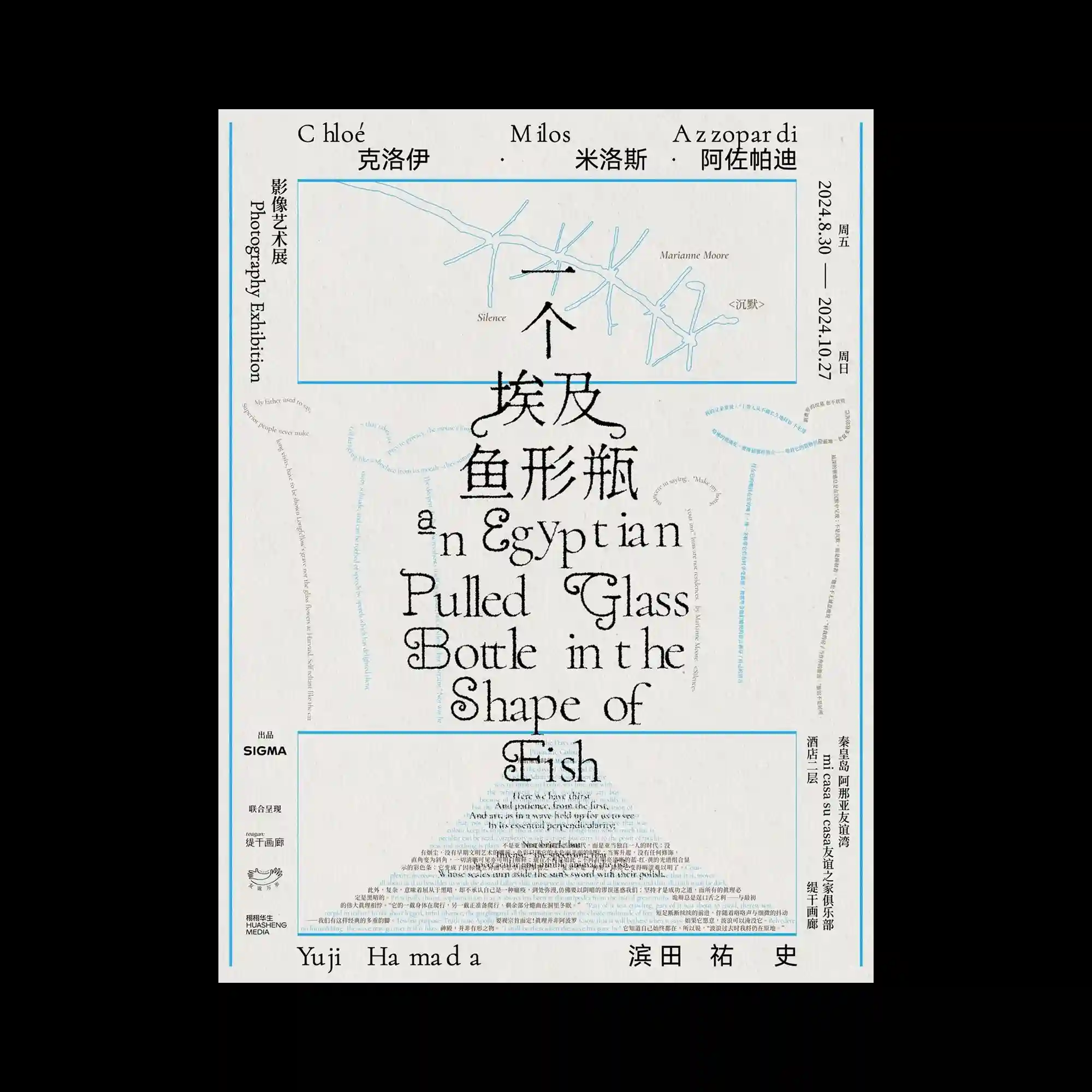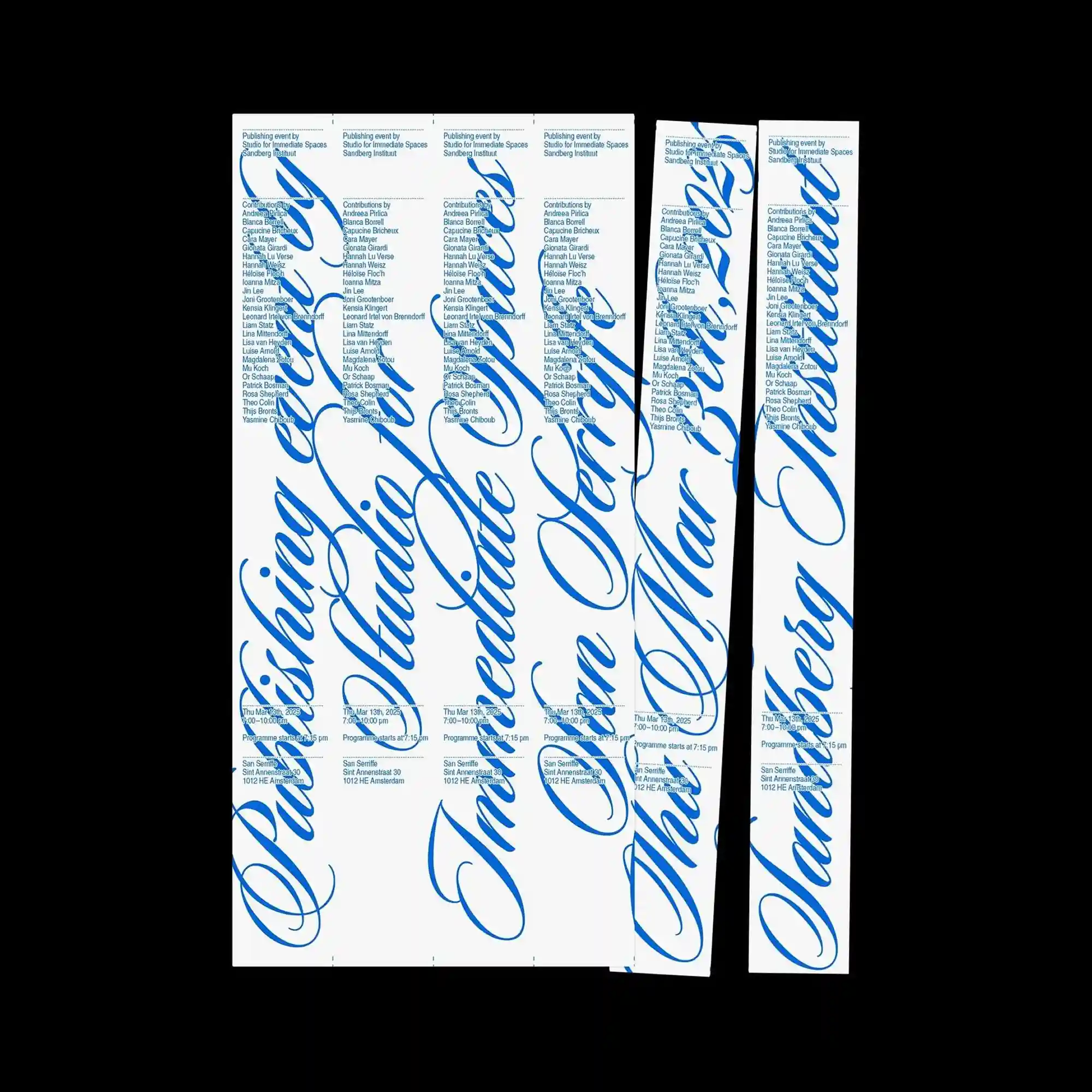 @w00_rk | Fluid, hand-drawn lettering spreads across the poster in soft blue forms that resemble liquid or inflated shapes. The text appears irregular and organic, creating a playful contrast with the rigid vertical columns of small informational text along the edges. The central area is dominated by these flowing letterforms that twist and expand across the surface. This contrast between structured side typography and expressive central lettering produces a dynamic visual hierarchy.