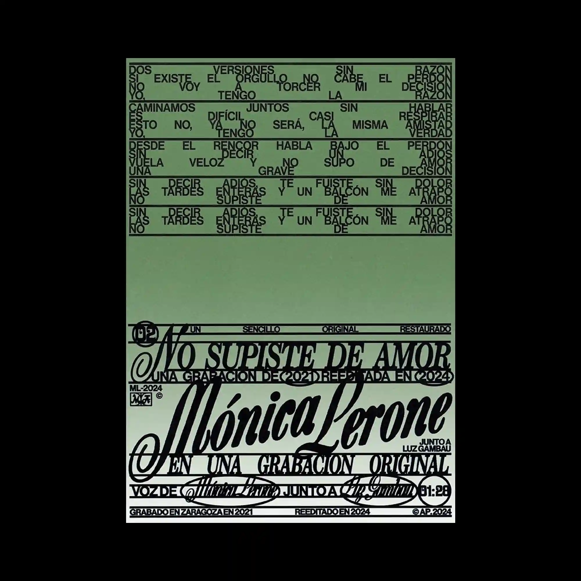 Vertical green lines of varying thickness extend across the composition, acting as both background pattern and structural grid. Bold black typography overlaps these lines, partially intersecting and breaking their continuity. The minimal color palette enhances contrast and focuses attention on alignment and spacing. The composition emphasizes repetition and interference between linear elements and text.