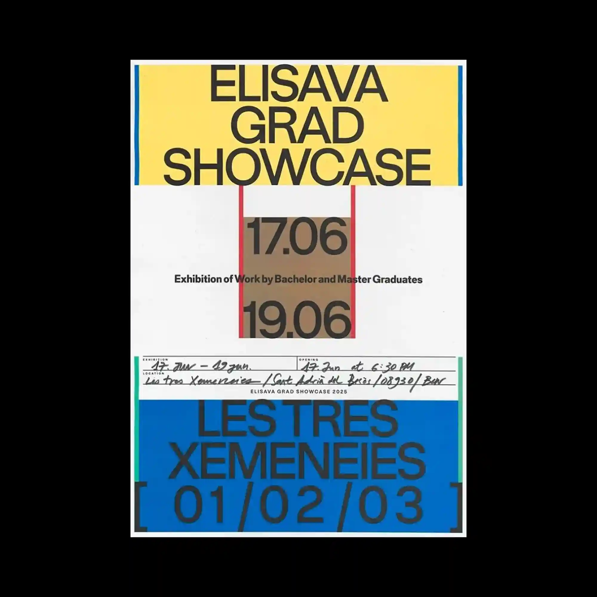 A modular layout organizes typographic elements into distinct blocks with varying sizes and colors, forming a balanced yet dynamic composition. Bold uppercase text anchors the design, while smaller handwritten elements introduce contrast and irregularity. The use of colored frames and dividing lines emphasizes segmentation and alignment. The composition integrates both structured and informal typographic styles within a unified grid.
