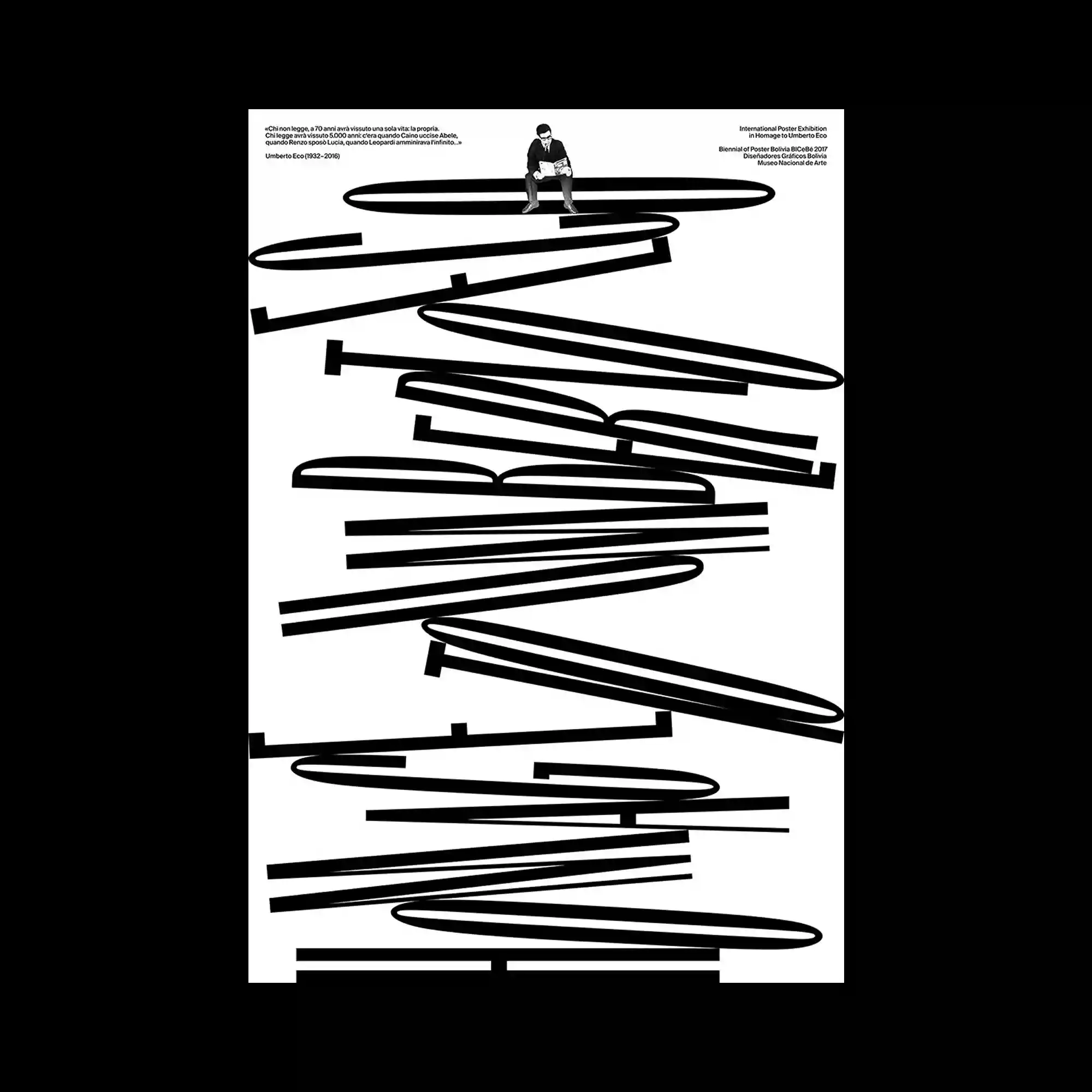 @orticastudio | Minimal black illustrations depict a simplified human figure repeating a sequence of bodily postures. The figures are arranged in a grid-like structure that alternates between standing, bending, and curled positions. Large serif typography flows across the composition, partially intersecting with the illustrated scenes. The restrained monochrome palette emphasizes the contrast between expressive body language and the structured typographic layout.