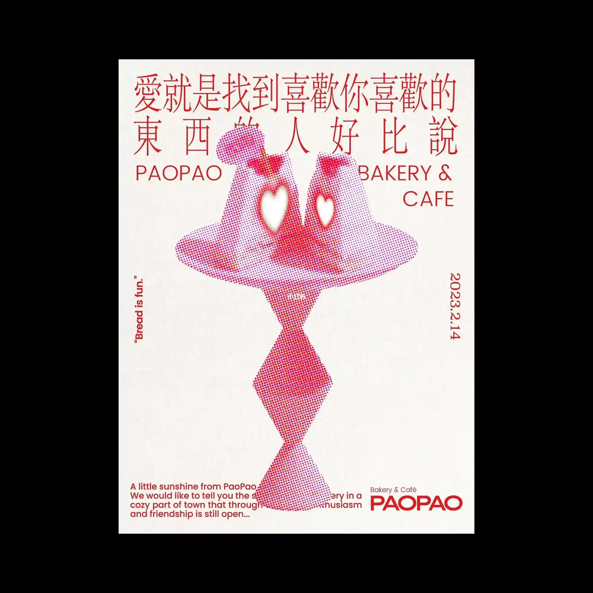 A halftone-rendered symmetrical figure occupies the center, constructed with dense red and magenta dot gradients that transition smoothly across the form. The shape resembles two mirrored organic silhouettes connected vertically, with heart-shaped negative spaces carved into the upper section. Surrounding this central composition, typographic elements in red are arranged in a loose grid, combining Chinese characters and Latin text with varying scales and alignments. The overall layout balances playful figurative abstraction with structured typographic placement, creating a layered visual hierarchy.