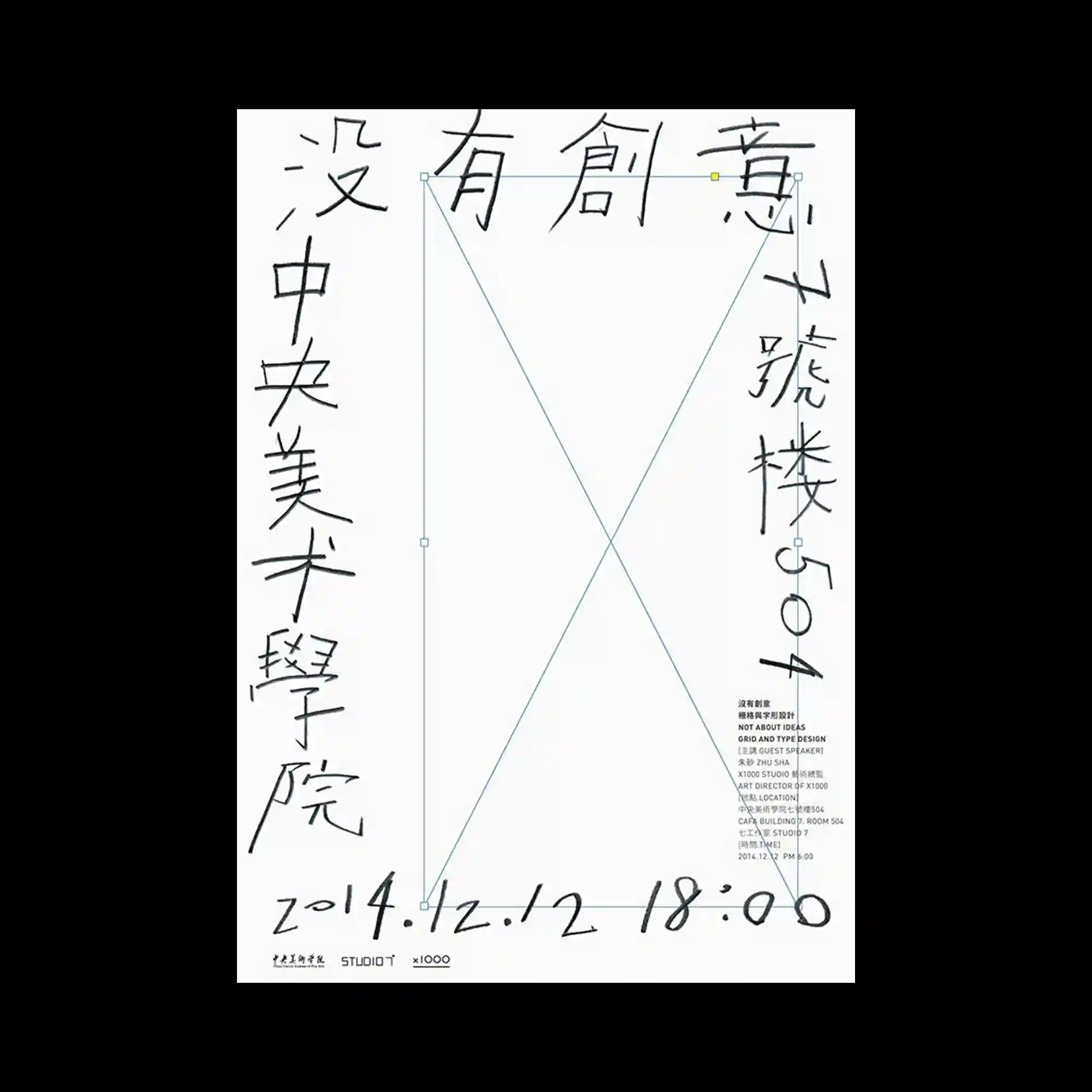 Handwritten-style typography surrounds a central rectangular frame, with lines crossing diagonally through its interior. The irregular strokes contrast with the rigid geometric frame, creating a tension between spontaneity and structure. Additional small typographic details are aligned to one side, maintaining balance within the asymmetrical layout. The composition merges informal mark-making with precise alignment.